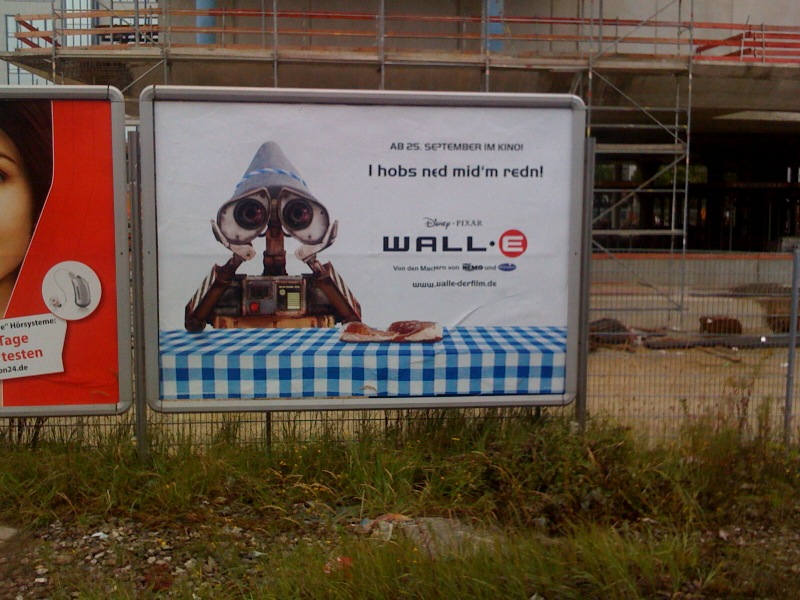 25. September 2008Bei uns in München ist derzeit die Wiesn. Ich war gestern Abend am Oktoberfest, hatte meine drei Maß, ein halbes Hendl und bin nach Hause gewankt. An der S-Bahn-Station lachte mir Wall•E entgegen. Auf einem Plakat saß der nette Roboter vor einem Hendl auf weißblauer Tischdecke. Darüber in gezwungenen bayerisch: „I hobs ned mid´m redn!“ Coole Sache, ich hab echt gelacht und kann jeden den neuen Pixar-Film empfehlen. Eine ausführliche Kritik zum Disney-Film gab es ja schon von mir im Blog. Das Plakat ist genial, das ich es gleich fotografiert habe. Vielleicht haben auch nur meine drei Maß meinen Verstand benebelt. Prost.