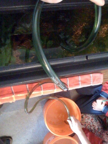 Das Vorgehen ist denkbar einfach. Es beruht auf reiner Physik. Man braucht dazu einen simplen Schlauch aus dem Baumarkt (am besten durchsichtig) und Eimer für das Altwasser. Ein Ende des Schlauches kommt ins Becken, am anderen Ende saugt man mit dem Mund kräftig an. Vorsicht, dass man kein Wasser in den Mund einsaugt und noch mehr vorsicht, dass kein Fisch mit dabei ist. Hat man das System in Schwung gebracht, läuft das Ablassen des Wassers ganz von allein.