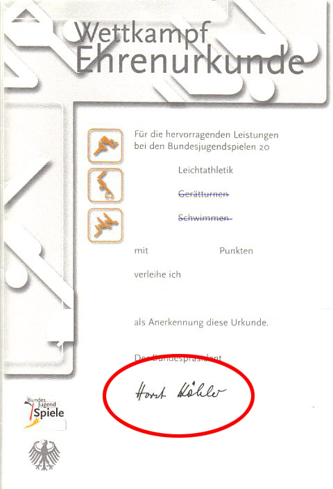 Die Ehrenurkunden zu den Bundesjugendspielen werden vom Bundespräsidenten unterschrieben und da wir den Bundeshorst nicht mehr haben, darf seine Unterschrift auch nicht mehr verwendet werden. Die tausendfach gedruckten Urkunden wandern ins Altpapier und die sportbegeisterten Schüler bekommen im Moment keine Urkunde. Danke liebe Politik für diese Motivationsbremse.