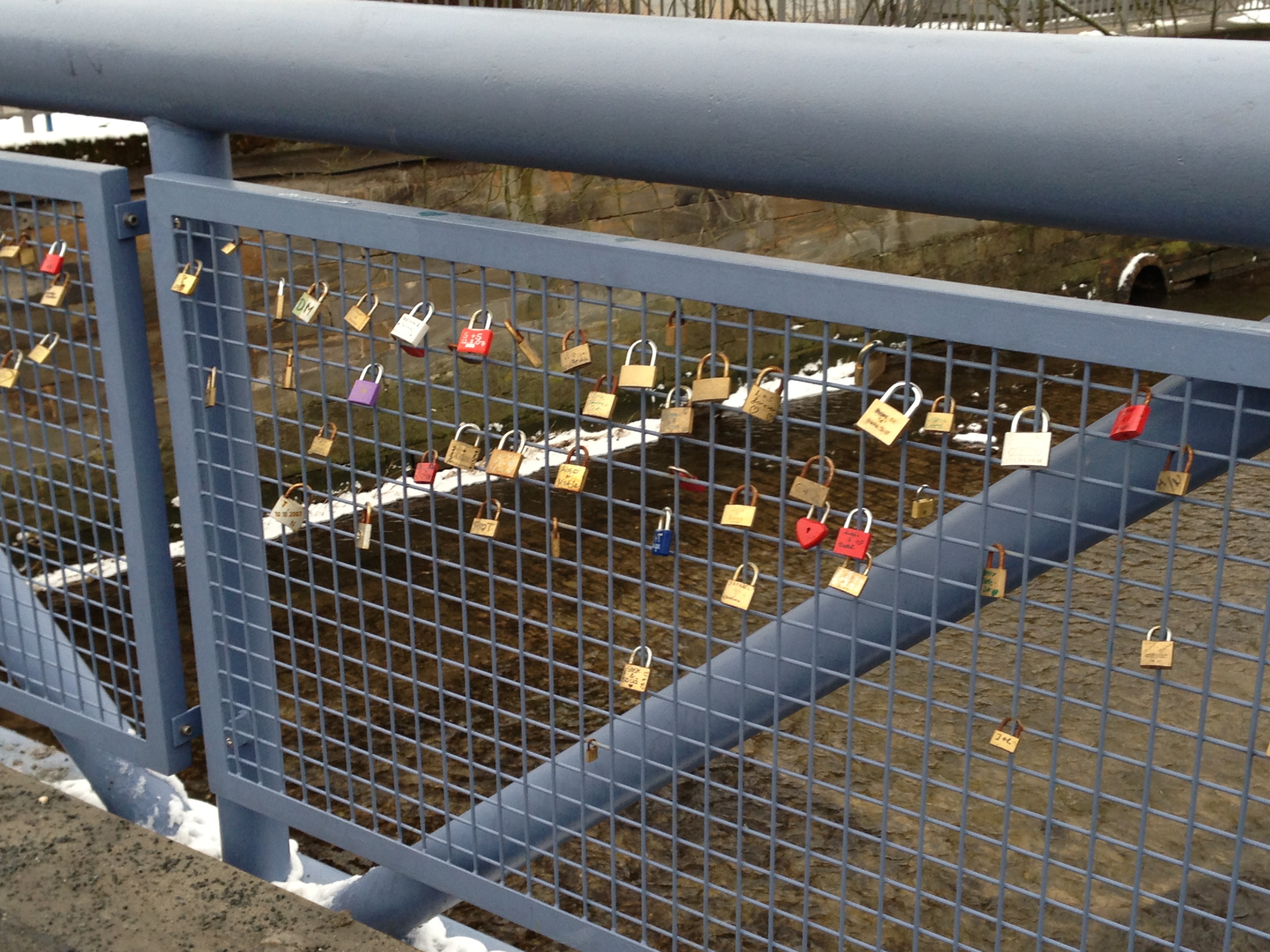 Seit 2008 ist die Welle der Liebesschlösser in Deutschland zu finden. Hauptsächlich an Brücken oder Zäune hängen sie zu Dutzenden und sollen ein sichtbarer Liebesbeweis sein. Das Zeichen einer ewigen Liebe. Bei einem Aufenthalt in Bayreuth entdeckte ich eine kleine Brücke hinter der AOK über den roten Main mit zahlreichen Schlössern. Einige der Schlösser scheinen schon eine ganze Zeit dort zu hängen, denn der Rost hat ihnen zugesetzt. Wollen wir hoffen, dass die Beziehung nicht angerostet ist. Einige Schlösser sahen sehr neu aus. Der Brauch scheint also immer noch lebendig zu sein. Es gibt nette Sprüche wie „Liebelei – für immer nur wir zwei.“ Nach dem Motto reim dich oder ich fress dich.