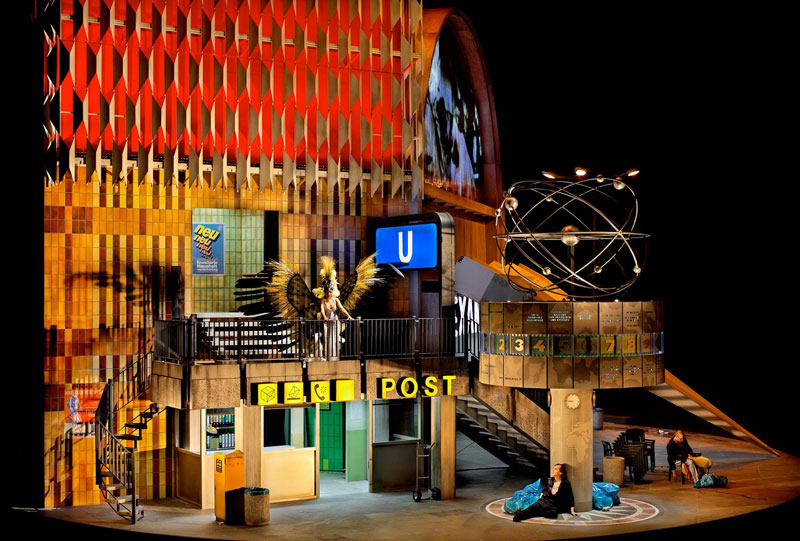 Unter der Regie von Frank Castorf und nach dem Bühnenbildentwurf von Aleksandar Denic, wurden im „Siegfried“ vielfältige Motive realisiert, beispielsweise der Berliner Alexanderplatz mit einer funktionsfähigen, maßstabsgetreuen Nachbildung der Weltzeituhr oder die Darstellung eines kinetischen Fernsehturmfußes. Die Rückseite zeigt eine massive Felswand mit einer kommunistischen Karikatur des US-amerikanischen Mount Rushmore. In der „Götterdämmerung“ trifft als Szenerie das originalgetreue Portal der New Yorker Börse im Maßstab 1:3 auf eine Berliner Hinterhofwelt, sowie die 12 Meter hohe Neon-Reklamewand „Plaste und Elaste aus Schkopau“, ein Relikt aus DDR Zeiten.