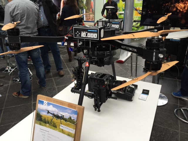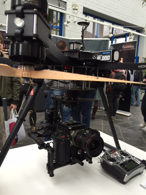 Aber richtig interessante Flugdrohnen habe ich dieses Jahr bei der SAE Alumni Conference in Berlin gesehen. Dort war The Black Drone mit seinen Profi-Drohnen als Aussteller dabei. Dort wurde unter anderem die Hammer X8 zum Preis ab 21.000 Euro präsentiert. Das Ding ist – schlichtweg gesagt – ein Hammer (daher wohl auch der Name). Die 15 kg schwere Drohne hat die Abmessungen von 800x800x450 mm. Gesteuert wird das Teil über die Multirotorsteuerung DJJ Wookong-M mit GPS. Der Antrieb bringt 8x KW Power über Elektromotoren und der Hammer X8 kann damit bis zu 30 Minuten in der Luft bleiben. Die Bilduübertragung erfolgt über Inmersion RC 25mW RX & TX Set oder ein fettes HD-System.