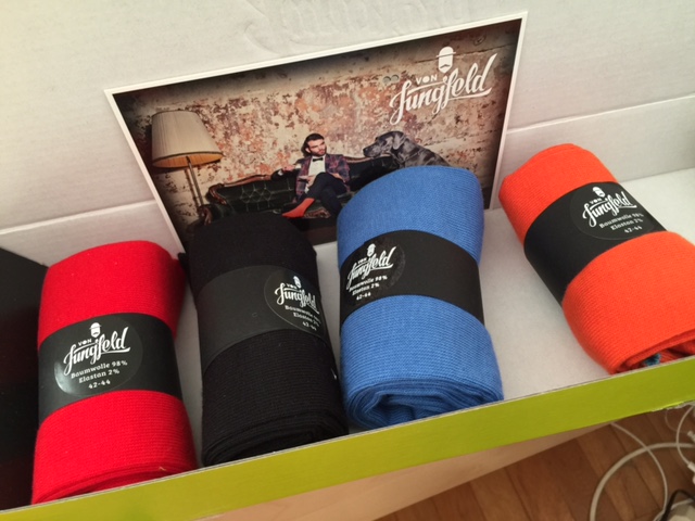 Im Moment bin ich zudem auf den Socken-Trip. Meine Frau hat mir zu Weihnachten die Farbexplosion von Jungfeld geschenkt. Bunte Socken in guter Qualität. Ich habe mir gleich noch ein paar Packen bunte Socken gekauft. Die Kombination bunte Socke und buntes Schuhwerk geht in der Regel schief, macht aber Lust aufs Experimentieren. Da kommen dann doch wieder schwarze Socken zum Einsatz.