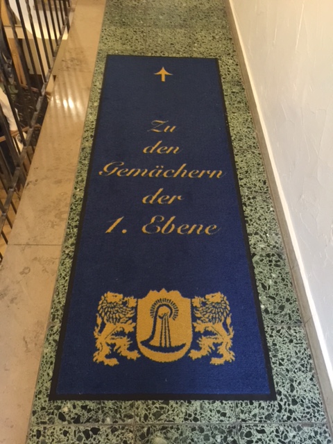 Wenn der Gast sich zu den Zimmer begibt, dann wandelt er auf einen Teppich mit der Aufschrift „Zu den Gemächern der 1. Etage“. Der Teppich ist blau und trägt das goldene Logo des Hotels Prinz Luitpold Bad mit einem großem L, das von zwei Löwen getragen wird. Ein Pfeil weist die Richtung. Und dieser Pfeil lenkt den Blick des Gastes auch auf ein historisches Spitzbogenfenster.
