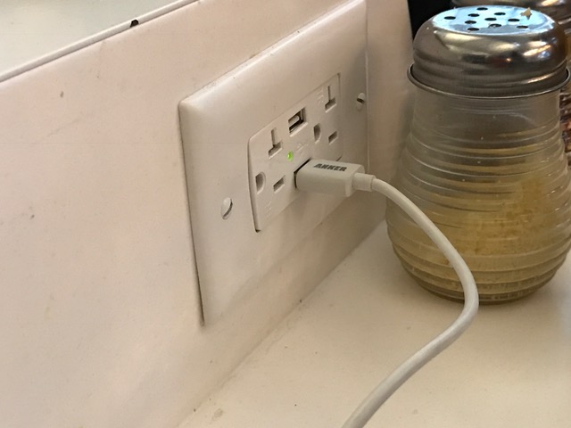 Jedes iPad ist fest mit dem Tisch verdrahtet, so dass es keine Füße bekommt und gestohlen werden kann. Am Tisch waren gleichzeitig Ladestationen mit US-Steckern und USB-Ports zum Laden der Smartphone angebracht. Diesen kostenlosen Service nutzen wir gleich aus.