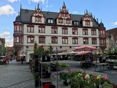 Und wenn ich so in Ruhe meine Bratwurst esse, mache ich mich auf die Suche nach den Original Coburger Erkern. Im Stadtbereich gibt es insgesamt fünf dieser Originalerker und zahlreiche Nachbildungen. Und ich habe Glück, am zentrale Marktplatz finde ich gleich welche. Da ich für eine zweite Bratwurst anstehe, habe ich einen Erker im Rücken. Im Coburger Stadthaus, gegenüber dem Rathaus, gibt es an der Gebäudeseite zum Markt gleich zwei dieser besonderen Erker. Da im Moment die bayerische Landesausstellung in Coburg stattfindet, lohnt sich der Besuch von Coburg auf jeden Fall und wenn man schon mal da ist, kann man auch Erker anschauen.