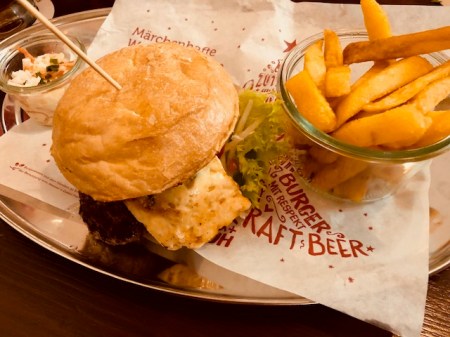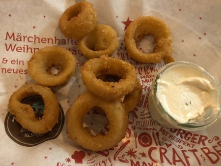 Die Burger-Karte kann sich sehen lassen. Das Fleisch kommt von Rindern aus der Umgebung. Während ich die Holzkarte studiere, sitze ich auf einem Rinderfell – ganz stilecht eben. Zudem konnte ich Fleisch für einen Highland Cattle Burger bestellen, was ich auch tat. Es ist Fleisch von schottischen Hochlandrind von Joe Engelhardt. Seine Rinder weiden zwischen Gangkofen und Augsburg auf ökologischen Ausgleichsflächen und sind das ganze Jahr im Freien. Ich wählte das Fleisch in Form eines Franzosenburgers mit Blauschimmelkäse und Feigensenf, den ich allerdings nicht geschmeckt habe. Dazu gab es dickem frische Pommes im Glas und zusätzlich Onion Rings mit Sour-Creme Dip.