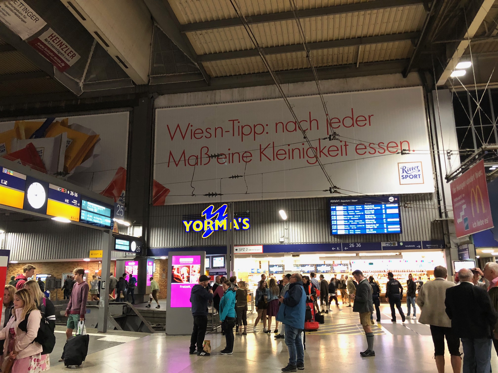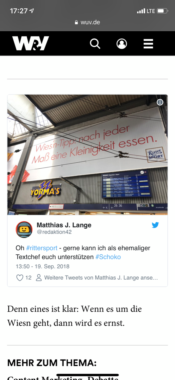 Und dennoch sorgte die Wiesn für meine 5 Minuten Ruhm in den Medien. Auf einer Reise zu meinen Vorträgen muss ich am Münchner Hauptbahnhof von der S-Bahn in den ICE umsteigen. In der auf Oktoberfest gestalteten Bahnhofshalle platzieren Firmen ihre großflächige Werbung. Die Werbetafel des Schoki-Herstellers Ritter Sport machte mich beim Gang zu meinen ICE stutzig: „Wies‘n Tipp: nach jeder Maß eine Kleinigkeit essen“. Gleich zwei Fehler in einer Werbezeile: Der Deppenapostroph und Maß statt Mass.