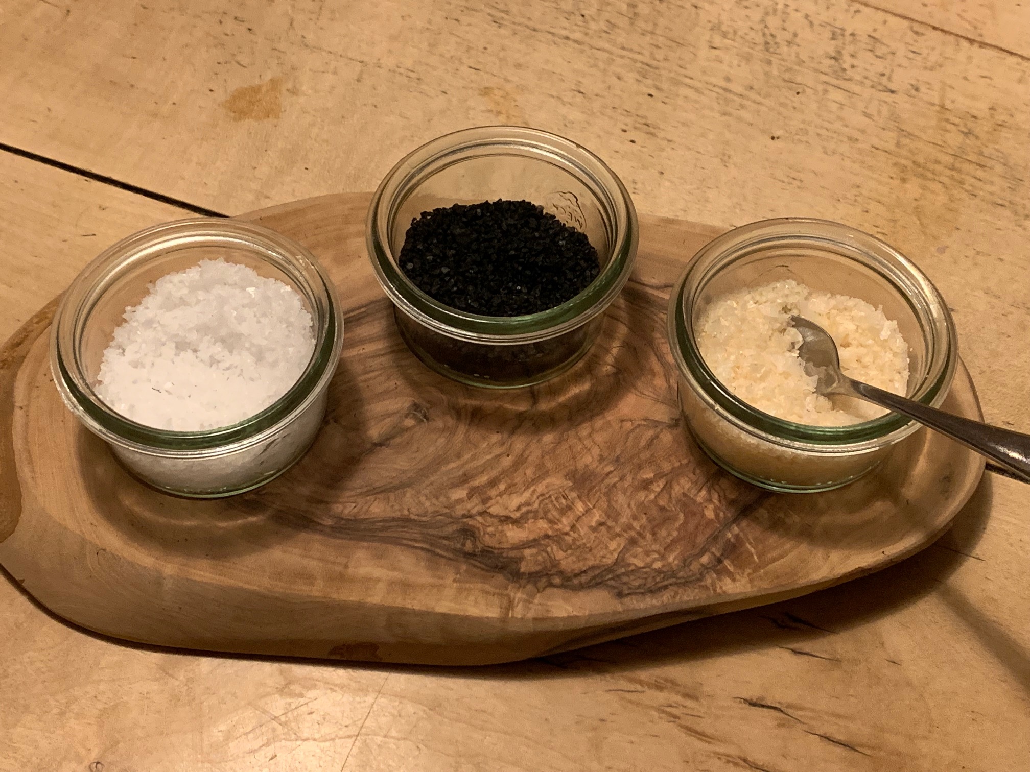 Ich griff zum T-Bone und stellte den Koch vor eine große Herausforderung: Ich wollte das Steak blutig. Das ist bei der Masse an Fleisch ein Problem bei der Zubereitung. Im Kern soll es warm und blutig sein, dabei darf das Äußere nicht zu stark durchgebraten sein. Beim Filet von K1 war das kein Problem, aber bei meinem dicken Steak kann es schiefgehen. Nun: Die eine Hälfte die T-Bone-Steaks war perfekt, die andere Seite zu durch. Aber ich weiß, dass die Herausforderung gemein war. Das Fleisch mit drei Sorten Salz schmeckte hervorragend: weißes fleur de sel, schwarzes Lava-Salz und beiges Himalaya-Salz.
