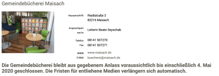 Auch die Gemeindebücherei soll dann wieder geöffnet haben. Ich mag die Lesungen in unserer Bücherei und die Leiterin Beate Seyschab und ihr Team machen einen guten Job in mitten ihrer 20.000 Medien. Aber durch Corona ist das Manko der fehlenden Digitalisierung in Maisach aufgetreten. Es gibt in der Gemeindebücherei keine Online-Ausleihe von digitalen Büchern, Zeitschriften oder Hörspielen. Es ist alles analog, ganz wie zu alten Zeiten.