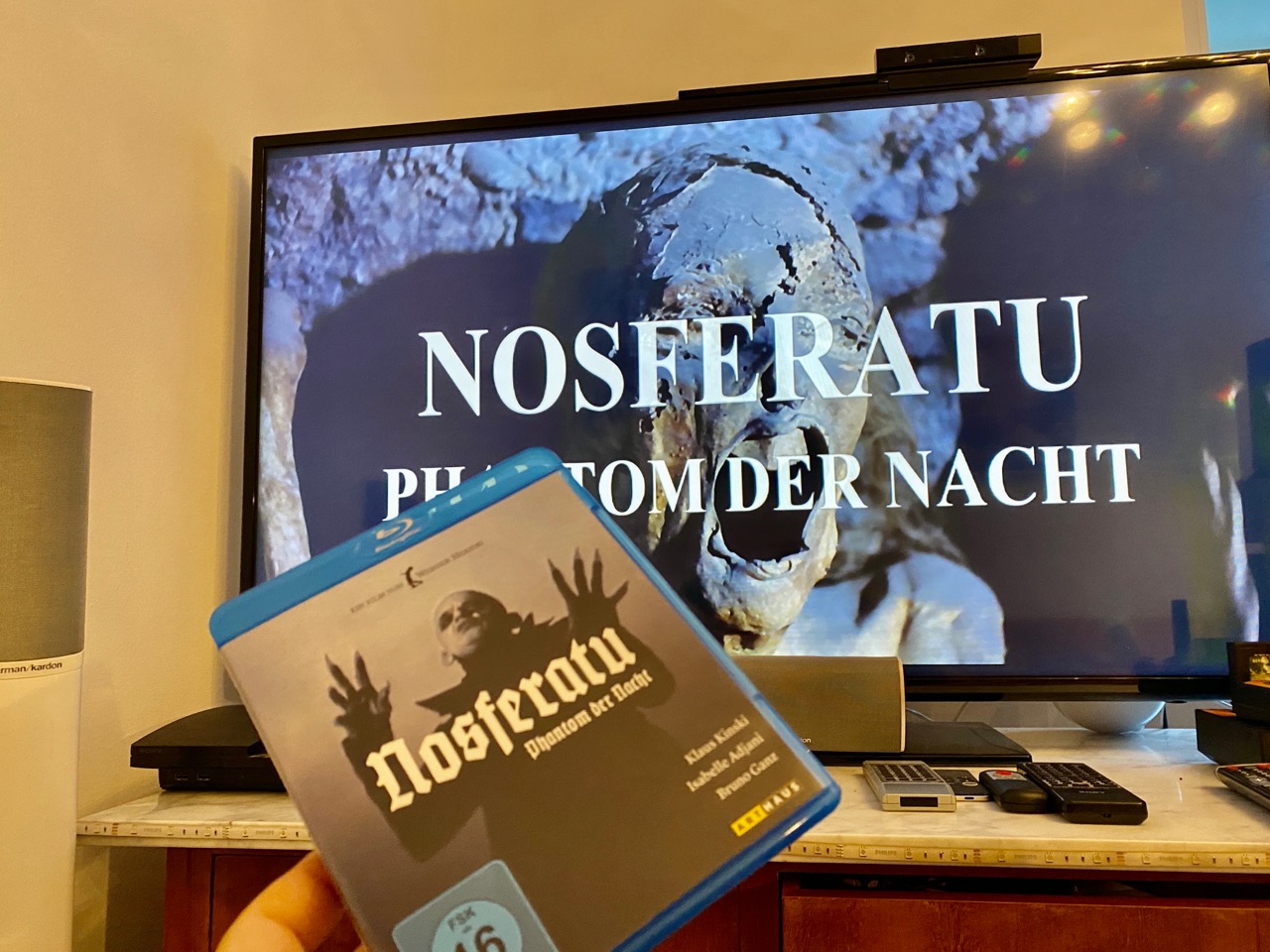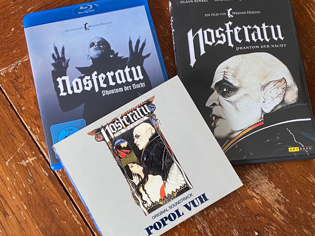 Herzogs Nosferatu – das Phantom der Nacht ist eine Neuinterpretation von Murnaus Nosferatu – eine Symphonie des Grauens – Klaus Kinski contra Max Schreck. Für mich ist der Stummfilm von Murnau noch immer der bessere Film, aber Herzogs Verfilmung des Stoffes hat seine großen Momente. In Ermangelung einer Laserdisc habe ich mir die Bluray angesehen, was dem Film Nosferatu technisch nicht gutgetan hat. Optisch bietet die Abtastung für Bluray allerdings dramaturisch interessante Elemente. Der Film versinkt in manchen Teilen in eine gewisse Unschärfe und wirkt für mich wie ein Fiebertraum beim Betrachten. Ob es Herzog so gewollt hat, kann ich nicht sagen. Die DVD in meinen Besitz erzeugt diesen Effekt nicht.