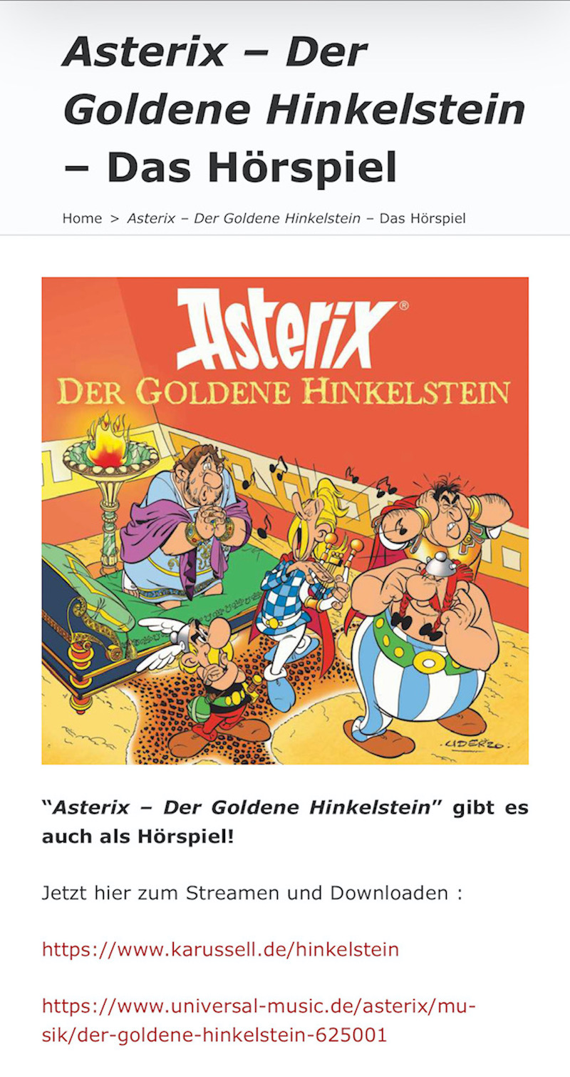 Hier die Hintergrundgeschichte zu Der Goldene Hinkelstein: Ursprünglich erschien in Frankreich die Geschichte als Hörspielschallplatte mit illustriertem Begleitheft. Das Hörspiel war schnell ausverkauft und ist heute ein begehrtes Sammlerobjekt. Lange war diese Geschichte vergessen und lange Zeit später wiederentdeckt. Ende 2019 wurden die Zeichnungen, die Albert Uderzo 1967 zur Untermalung des Szenarios seines Freundes René Goscinny anfertige, von Mitarbeitern und noch unter Aufsicht des im März 2020 verstorbenen Maestros restauriert. Auf Deutsch erschien der Goldene Hinkelstein nun zum ersten Mal. Das 33minütige Hörspiel gibt es jetzt auch auf den bekannten Streamingplattformen.