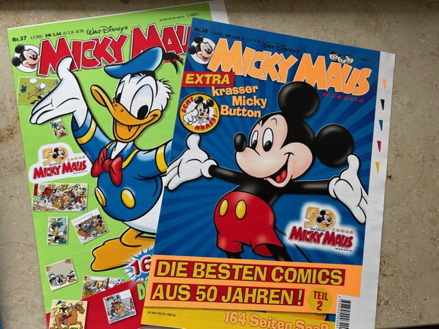 Das Highlight vor 20 Jahren: Das erste Micky Maus Magazin aus dem 1951 gab es als Nachdruck als Geburtstagsgeschenk. Die Ausgabe war eingeschweißt in goldenes Glanzpapier. Sie kostete am 29. August 2001 genau 3,40 Mark und war Ausgabe 36. Ich hab sie noch verschlossen gelassen, denn die Geschichte von damals gibt es ja immer zu lesen. Vielleicht öffnen meine Kinder die Ausgabe irgendwann nach meinen Ableben.