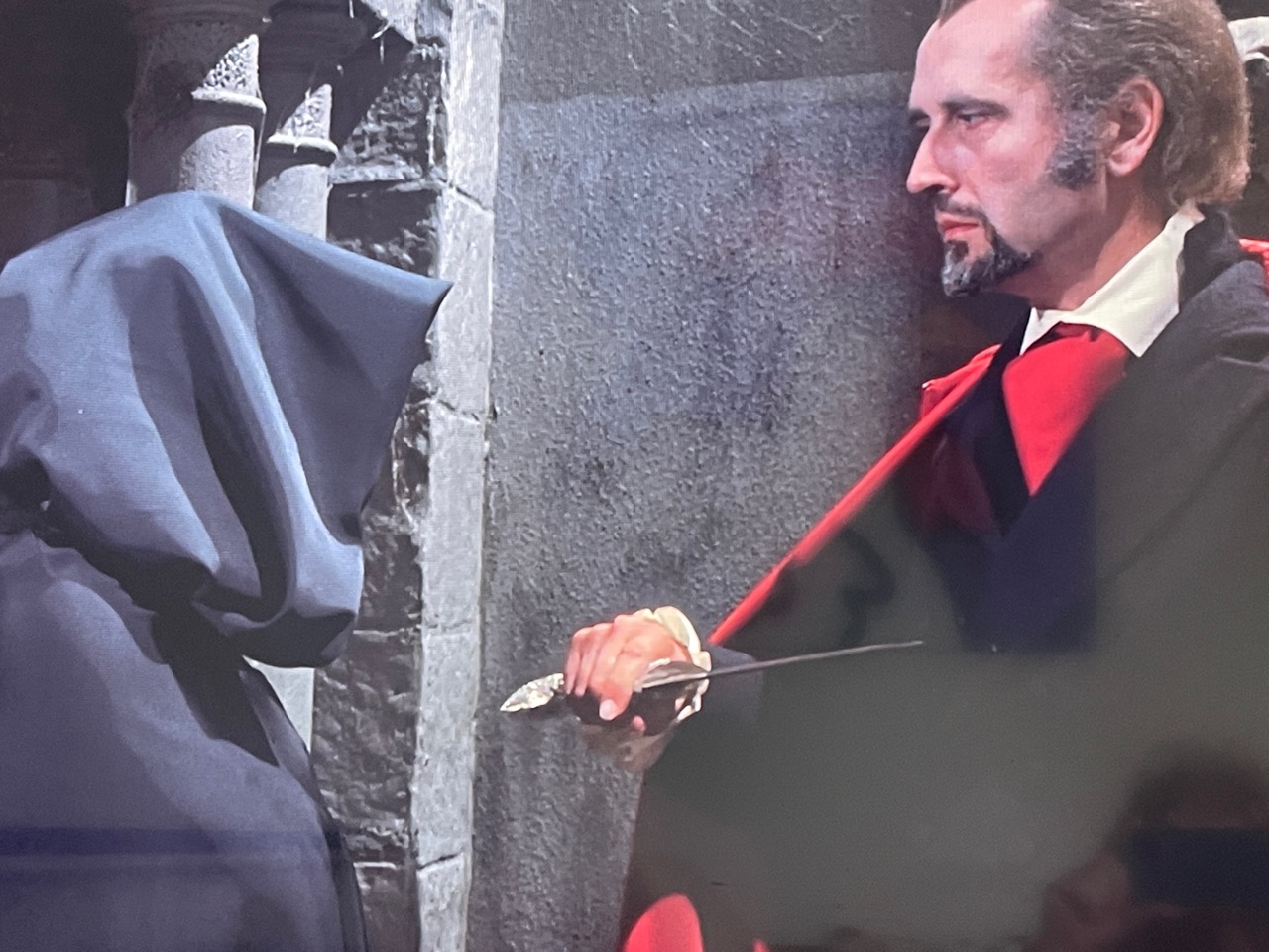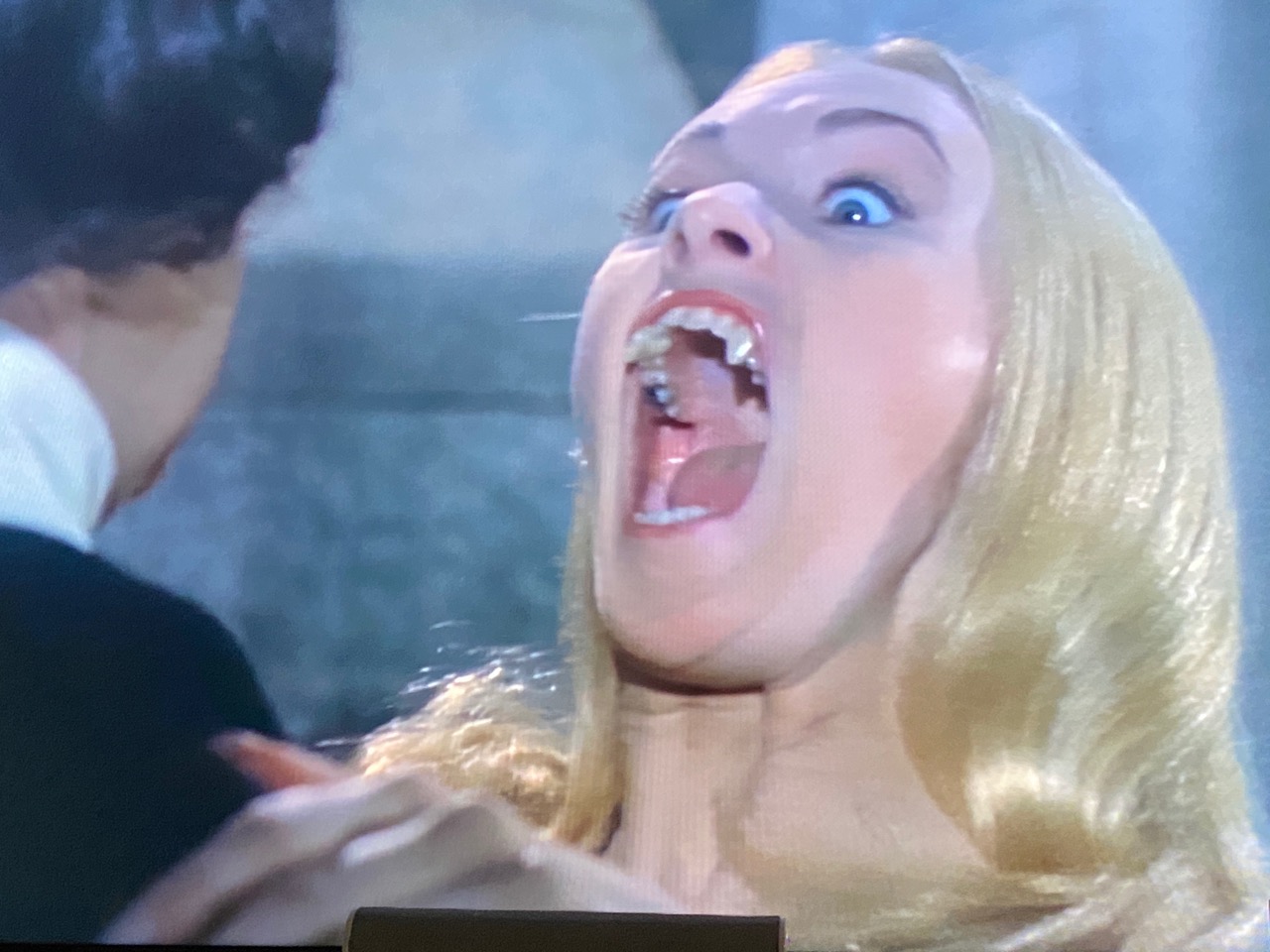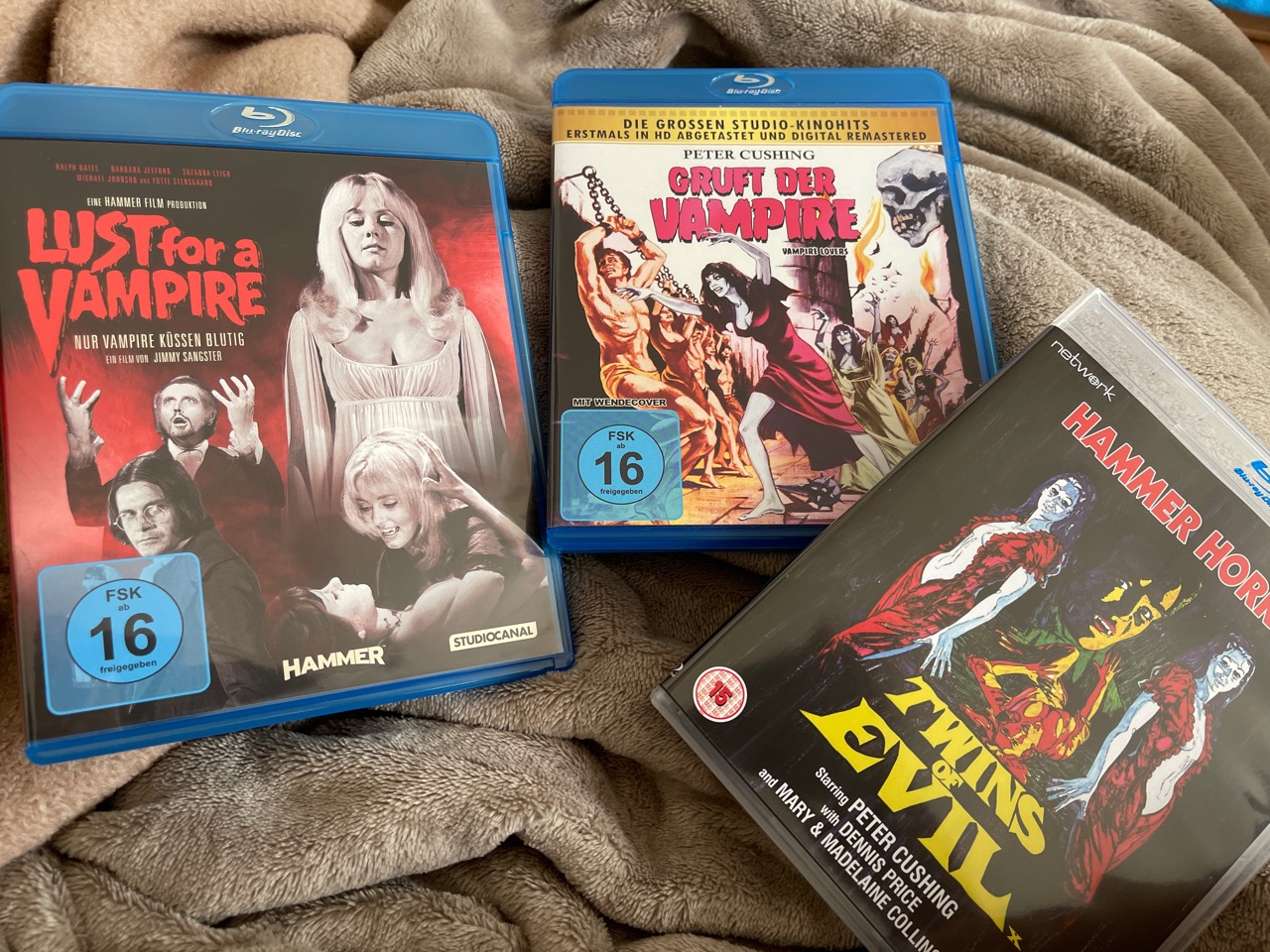 Das Thema der lesbischen Vampire muss damals im Kino ziemlich heftig angekommen sein. Die bisher nicht gekannte Mischung von Sex und Blut war schon ein echter Hammer (ha, Wortspiel). Zum ersten Mal war in einem Hammer-Film auch ein Pop-Song zu hören: „Strange Love“, gesungen – nein gehaucht von Tracy. Das Ganze ist schon sehr schwülstig. Ich hatte in London mal die Single in meiner Hand, kaufte sie aber nicht, weil sie überteuert war. Vielleicht hätte ich es tun sollen. Der letzte Film der Karnstein-Reihe Draculas Hexenjagd (Twins of Evil) ist sicherlich der beste Teil der Reihe. Mircalla darf kurz auftauchen und ihre Reize zeigen, aber im Mittelpunkt stehen die ehemaligen Playboy-Schönheiten Mary und Madeleine Collinson, eben die Twins of Evil. Übrigens sind sie auch im englischen Original nachsynchronisiert, das bedeutet, aufgrund der Schauspielleistung wurden die Damen nicht gewählt. Absolut genial ist Peter Cushing, der alle an die Wand spielt. Seine Frau Helen verstarb zwei Wochen vor den Dreharbeiten und vielleicht kanalisierte Cushing hier seinen Schmerz. Cushing lieferte eine der besten Rolle seines Hammer-Lebens ab. Und die Kombination aus fanatischen Hexenjäger und sexy Vampire war auch ein neues Element des Horrorfilms. Übrigens, die deutsche Version von Twins of Evil ist schwer zu bekommen. Da wähle man die preisgünstige englische Version.