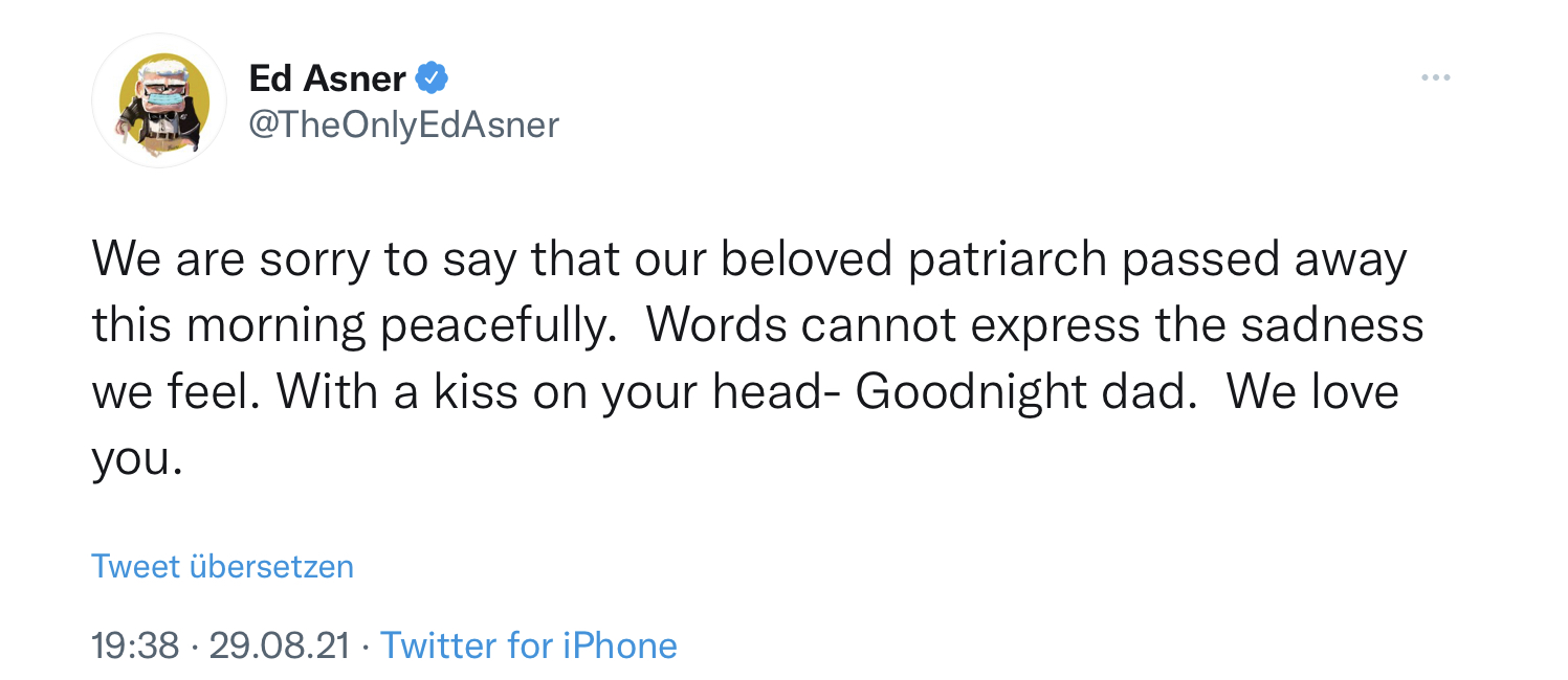 Ed Asner war immer als Schauspieler unterwegs. Zuletzt fiel er mir in Pixars Animationsstreifen 2009 Oben/Up auf, als er in der US-Version der Hauptfigur Carl Fredricksen seine Stimme lieh. Aber für mich bleibt er immer Lou Grant mit einem Herz aus Gold.