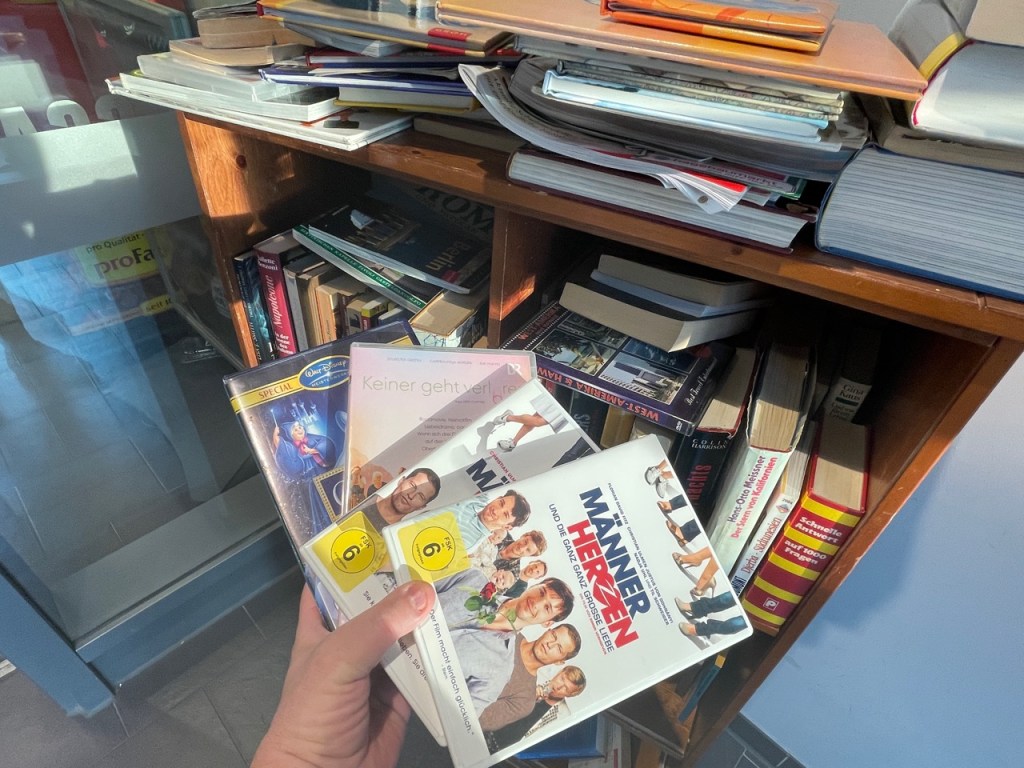 Dabei ist mir aufgefallen, dass im Bücherschrank nicht mehr nur Holzmedien wie Bücher und ein paar Zeitschriften zu finden sind, sondern auch Filme. Mehr und mehr tauchen dort VHS-Cassetten, DVDs und auch Blurays auf. Auch ein paar Muskikcassetten MC habe ich immer wieder gesehen.