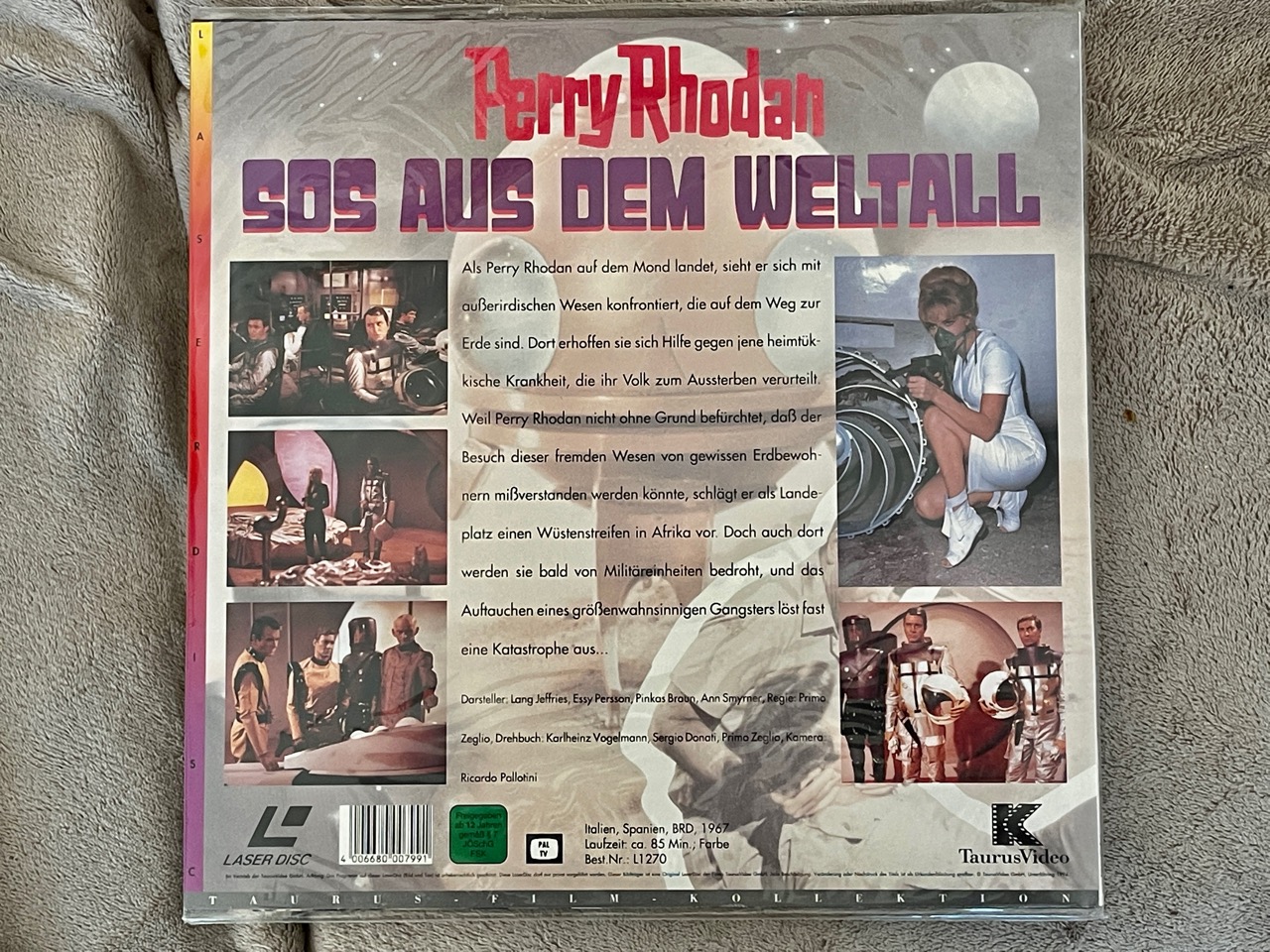Zur Feier des Tages schaue ich mir die Perry Rhodan Verfilmung aus dem Jahre 1967 an: Perry Rhodan SOS aus dem Weltall auf Laserdisc an. Als Kind faszinierte mich das Raumschiff in Quallenform. Der Film umfasst die drei ersten Romane plus Agentenstory – leider ist die deutsche Fassung gegenüber der angloamerikanischen (Mission Stardust) um 15 Minuten gekürzt. Grund unbekannt. Ich kenne auch die US-Fassung nicht. Der Film flippte, was kein Wunder ist. Es ist Trash-Kino: Schlechte Darsteller, schlechte VFX und schlechte Geschichte. Am 13. September 2013 wurde der Film Perry Rhodan – SOS aus dem Weltall im Rahmen der Tele-5-Reihe Die schlechtesten Filme aller Zeiten gezeigt. Und ich gestehe: Der Film ist wirklich schlecht, egal ob man Perry Rhodan Fan ist oder nicht.