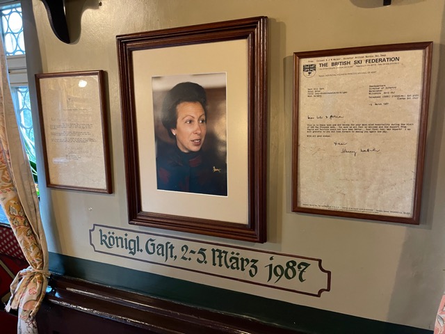 Die Karte umfasst deftige, gut bürgerliche Speisen aus Produkten der Region Allgäu-Bodensee-Oberschwaben. Die Wirtsleute sind freundlich und wenn das Wetter passt, kann der Gast auch vor der Türe im Biergarten sitzen. Aber genau dies will ich nicht: Ich will die historische Atmosphäre des rustikalen Gastraums genießen. Ich sitze an einem Tisch. Prinzessin Anne schaut mir von der Wand gegenüber auf meinen Teller. 1987 weilte die britische Prinzessin Anne als Schirmherrin der englischen Nationalmannschaft bei den Lowland-Skimeisterschaften in Isny und nächtigte im Gasthof Adler. Anne sieht wie immer ein wenig streng aus, aber so ist es wohl im britischen Königshaus.