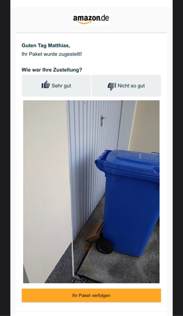 Also die Mail von Amazon herausgesucht und geöffnet. Und ich hab eine Neuerung festgestellt. Der Amazon-Fahrer hat ein Foto mitgeschickt, wo mein Paket liegt. Es lag hinter der blauen Altpapiertonne, also nicht bei der Mülltonne. Aber das sind Feinheiten des deutschen Wertstoffkreislaufsystems. Ob es jetzt die Tonne für stoffgleiche Nichtverpackungen, Papiertonne, Restmülltonne, Tonne für organische Abfälle oder anderes ist, das kann man einen Fahrer nur bedingt vermitteln.