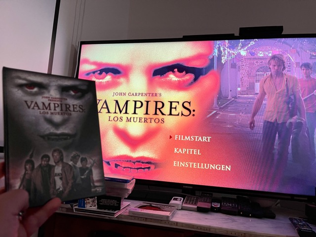 Inzwischen gibt es einige Perlen in diesem Bereich, wobei für mich der Kannibalen-Western Bone Tomahawk von 2015 in jüngster Zeit absolut heraussticht. Dem Media-Book von John Carpenter’s VAMPIRES: LOS MUERTOS liegt übrigens ein absolut lesenswertes Booklet von Christoph N. Kellerbach bei, das es zu diskutieren gilt. Er ordnet den Film sehr gut in die Veröffentlichung des Wildwest-Horrors ein und gibt uns ein paar Produktionshintergründe. Und als Freund der Filmmusik sollte man Komponist Brian Tyler auf jeden Fall erwähnen, der ganze Arbeit geleistet hat. Leider ist meines Wissens, dieser Score offiziell nicht als Datenträger erschienen, es gibt aber eine nichtautorisierte Version auf CDR.