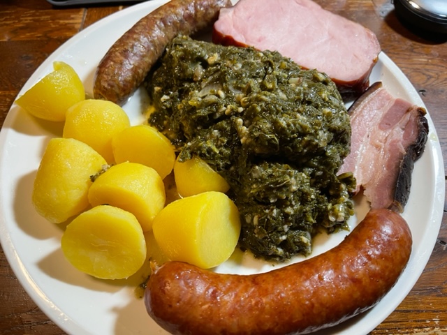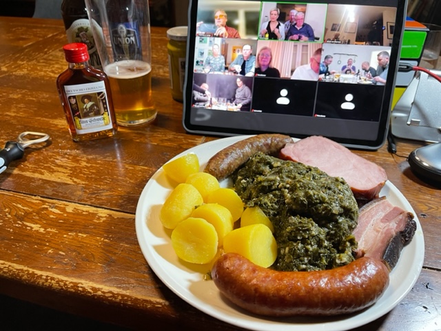Ich hatte die Biere in der richtigen Reihenfolge auf meinen Wohnzimmertisch aufgebaut, öffnete die Flaschen, schenkte den Gerstensaft in Glas, prüfte den Inhalt und hielt ins ins Licht, hörte die Geschichten rund ums Bier und den Brauern und genoss den Abend. Nachdem zwei Biere verkostet waren, kam der Grünkohl und Pinkel an die Reihe. Ich servierte die großzügigen Portionen meiner Frau und mir, legte eine Serviette bereit und genoss die vitaminreiche Kost. Ludger erzählte, zitierte Gedichte, berichtete von seinen Erfahrungen als gelernter Metzger-/Fleischermeister. Kurz gesagt: ich fühlte mich wohl und freute mich, dass ich ihn mal wieder sehen konnte – zumindest virtuell.