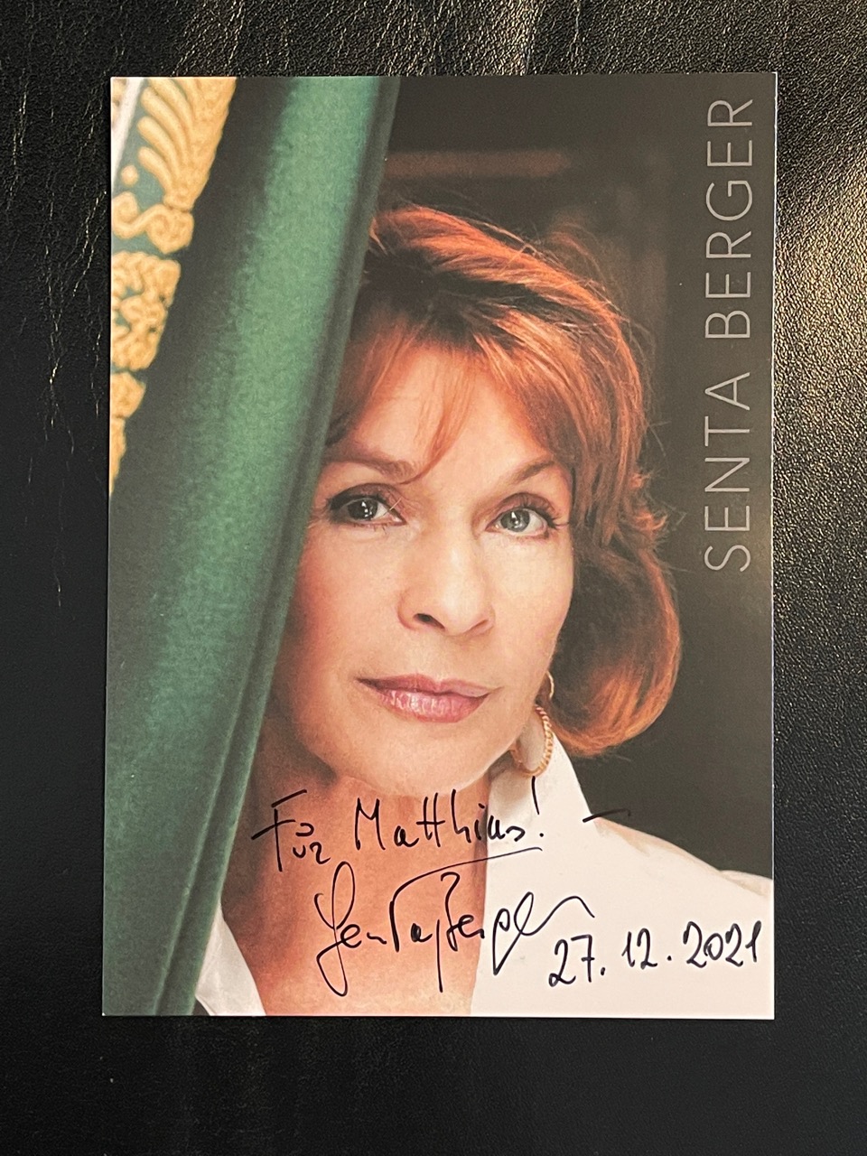 Senta Berger schrieb auf ihre Autogrammkarte für mich neben Namen und Datum auf der Rückseite den legendären Satz „… schreibst ja sonst über jeden Deppen“ aus der ersten Kir Royal-Folge. Danke für so viel Humor.
