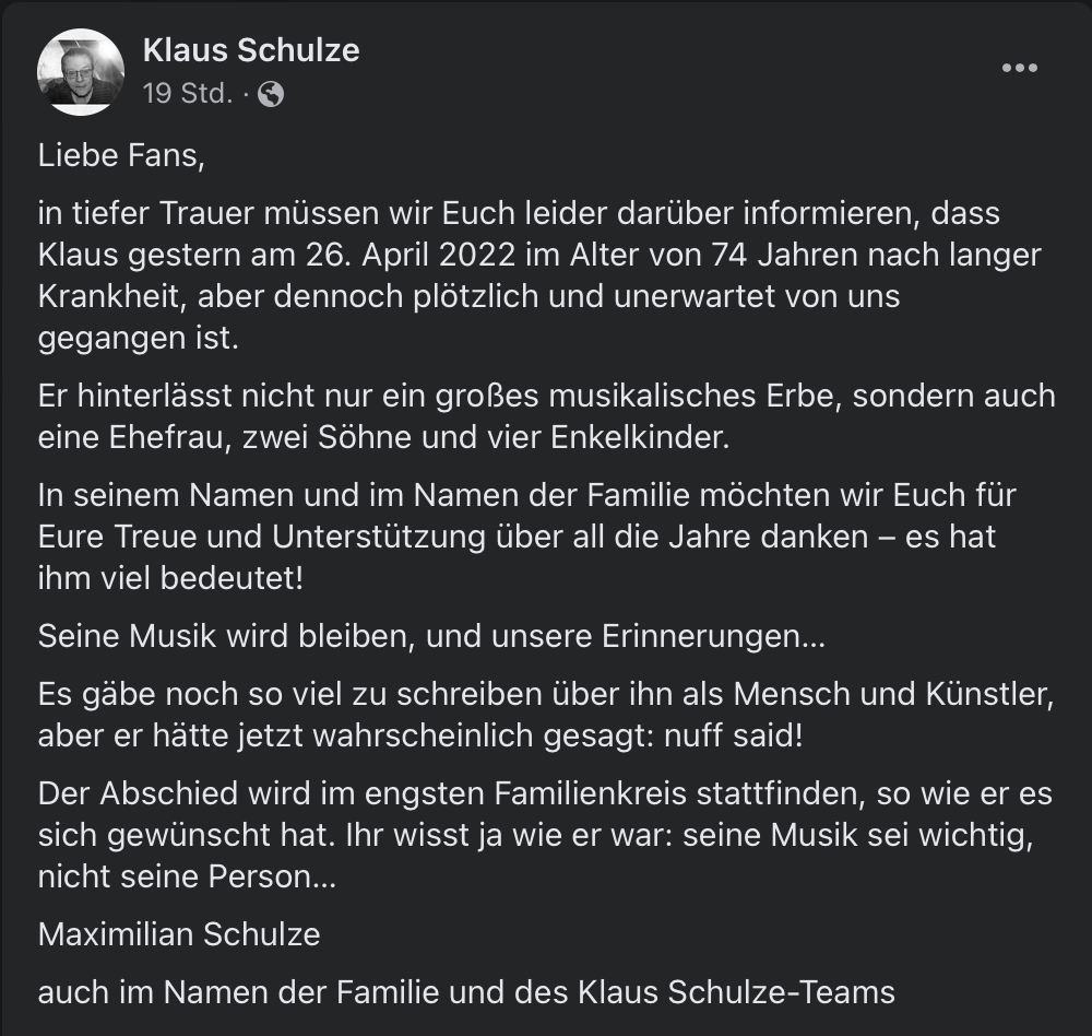 Völlig überraschend verstarb Klaus Schulze im Alter von 74 Jahren. Ich bin schockiert und traurig. Ich wollte den Ausnahmemusiker doch so gerne einmal treffen. Schulze war für mich einer der wenigen deutschen Superstars der Musikszene und sein Tod berührt mich sehr.