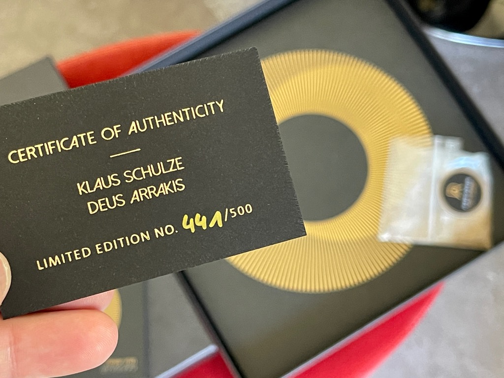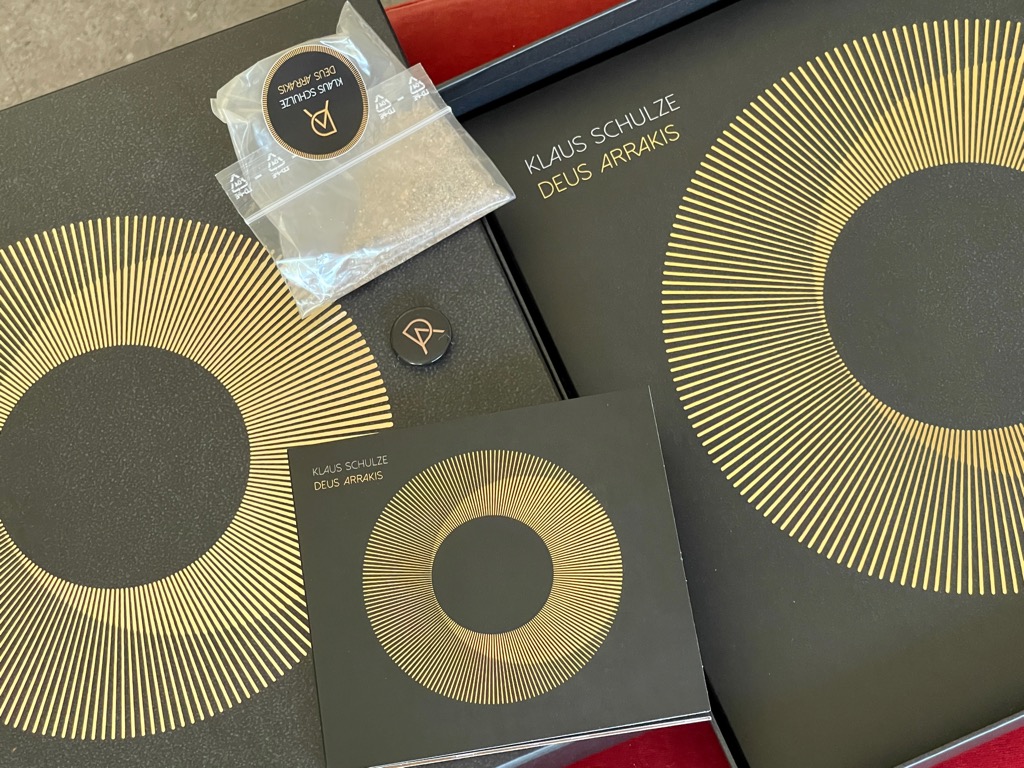 Deus Arrakis heißt das Album und ich habe mir die auf 500 Exemplare limitierte Sammler-Box geleistet. Ich habe die Nummer 441. Sie enthält drei goldene Vinyl-Schreiben, die CD, einen Pin sowie Sand (!) und ein gerahmtes Artwork mit Autogramm vom Meister. Für letzteres suche ich noch einen Ehrenplatz in meiner Bleibe. Es gibt die CD und Vinyl auch einzeln. Die Box war schnell ausverkauft.