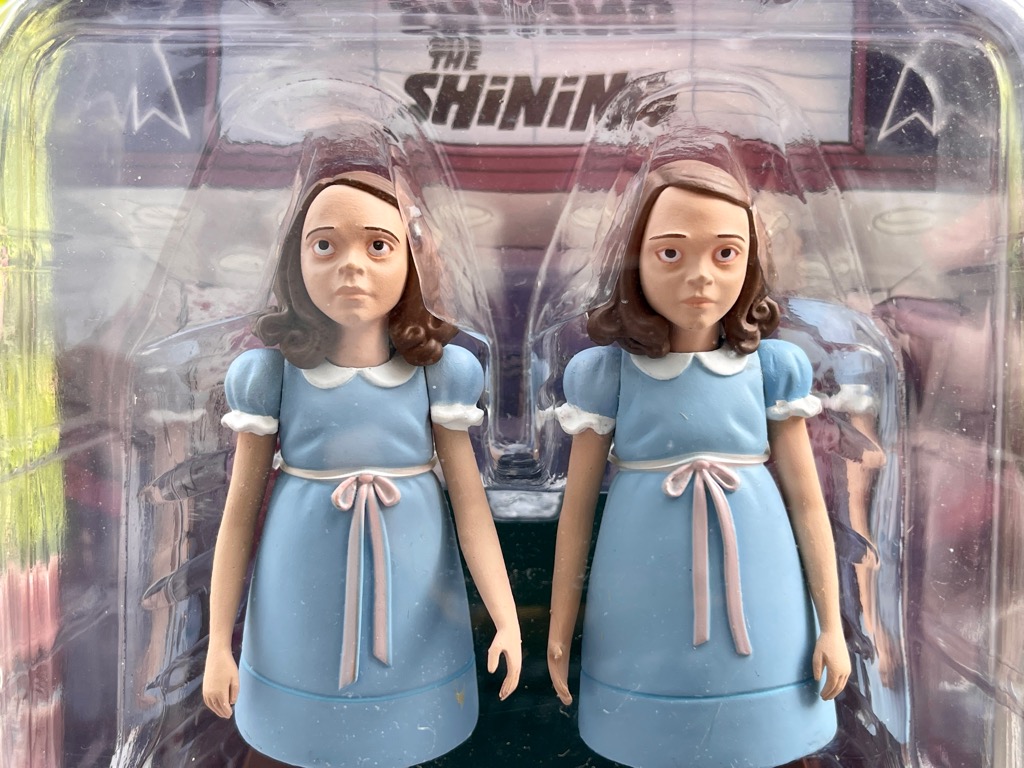 Jetzt habe ich die beiden Zwillinge als Sammler-Figur, herausgegeben von Neca in der Reihe Toony Terrors. Die Figuren wurden von Adrienne Smith geschaffen und sind in eine Art Kinoreklame verpackt, das von Chris Raimo kreiert wurde. Auf der Rückseite der Blisterkartonverpackung ist der Gang zum Ausschneiden abgedruckt in dem der Zuschauer die Zwillinge begegnet. Neca hat die 15 Zentimeter Version der lebenden Zwillinge in den Verkauf gebracht. Die Version mit den Kinderleichen samt Axt gibt es nicht, wäre aber für den Shining-Fan auch interessant.