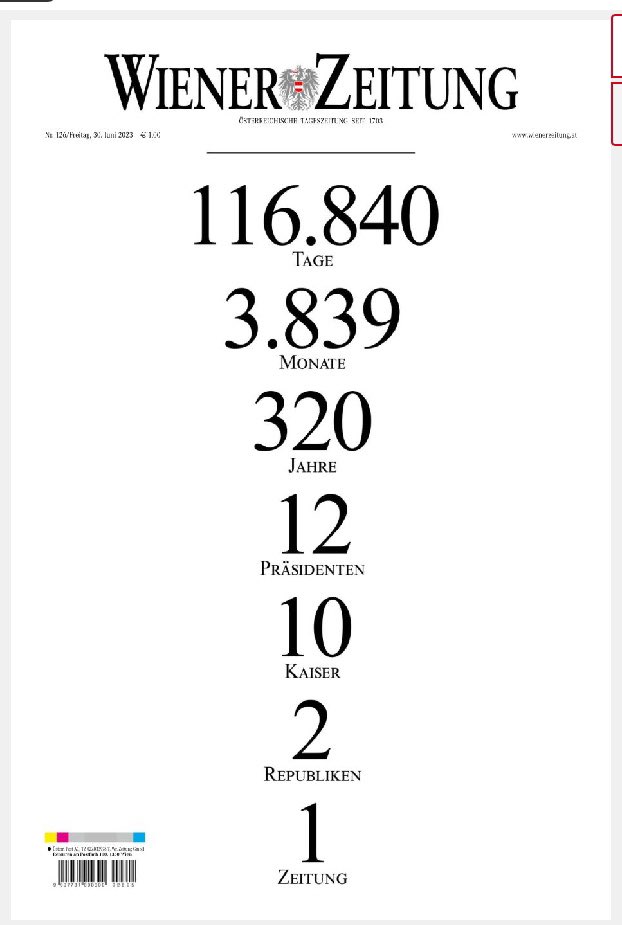 Eine Ära geht zu Ende. Nach 320 Jahren ist nun die letzte Print-Ausgabe der Wiener Zeitung erschienen. Es war die älteste gedruckte Zeitung auf diesem Planeten. Nun ist Schluss mit Papier, es soll online weitergehen.