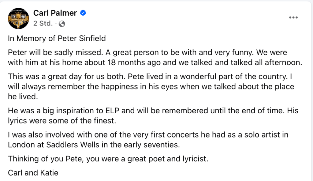 Heute läuft schon den ganzen Tag die Musik von und mit Pete Sinfield. Die wenigsten Musikfreunde außerhalb der Prog- oder Lyrikszene werden diesen Namen überhaupt kennen. Auf jeden Fall ist der Mann, der viel für meine persönliche Musikgeschichte zu tun hat, im Alter von 80 Jahren verstorben. Carl Palmer wies auf den Tod des Künstler in Facebook hin.