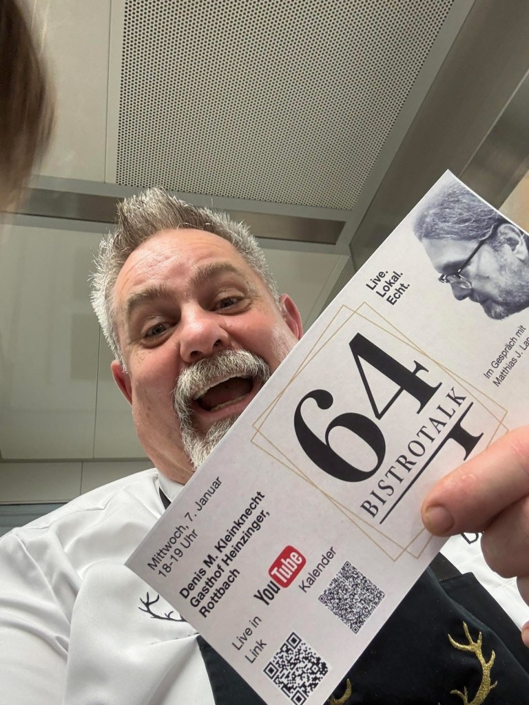Ich kenne Denis Kleinknecht seit Jahren als engagierten Gastgeber mit seinem vorzüglichen regionalen Speisen und ich weiß auch, dass Denis Kleinknecht ein Freund des deutlichen Wortes ist. Somit ist ein interessantes Gespräch vorprogrammiert. Mal sehen, ob ich ihm das eine oder andere Geheimnis entlocken kann. Also einschalten.