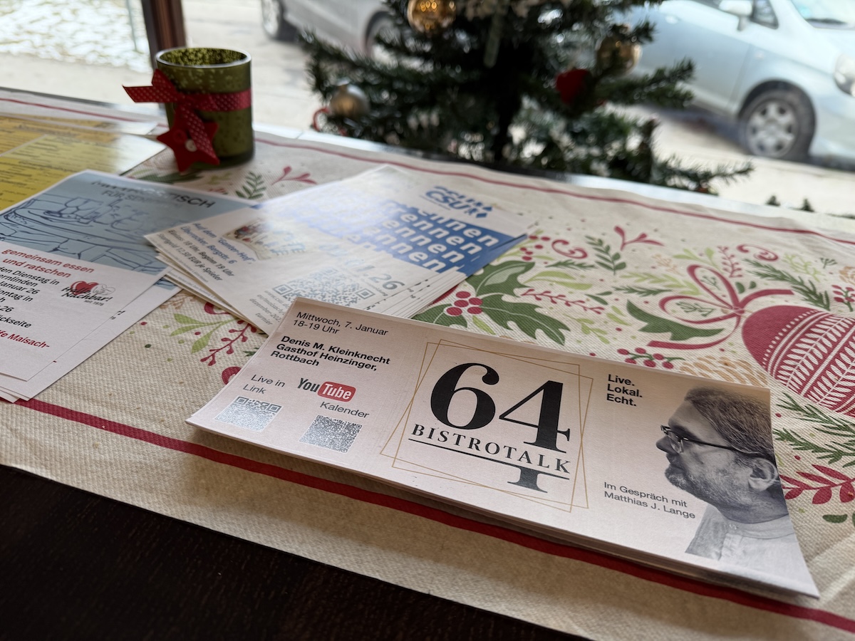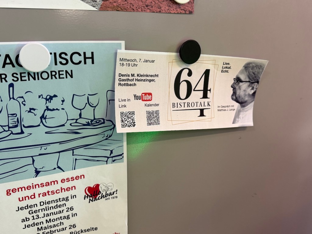 Schlagwörter: authentisch, Bistro SixtyFour, Bistrotalk, bodenständig, Denis Kleinknecht, ehrliche Küche, Gastfreundschaft, Gastgeber, Gasthof Heinzinger, Gastronomie, Gemeinde Maisach, Gesprächsformat, Live Lokal Echt, Live-Stream, Live-Talk, lokale Persönlichkeiten, Mittwochabend, Publikumsbeteiligung, regionale Küche, Rottbach, SixtyFour Maisach, Youtube, Zentrumspassage Maisach