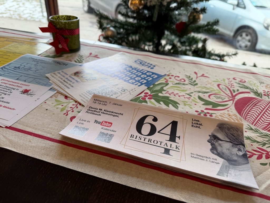 Nochmal an dieser Stelle vielen Dank an Uwe Flügel vom SixtyFour, der mir eine Stunde seine Theke als Streaming-Studio zur Verfügung stellt und dem BistroTalk seit über einem Jahr eine Heimat gegeben hat. Ich verstehe den BistroTalk als Beitrag zur Kommunikation in der Gemeinde Maisach und lade in regelmäßigen Abständen Gesprächspartner aus der Gemeinde ein.