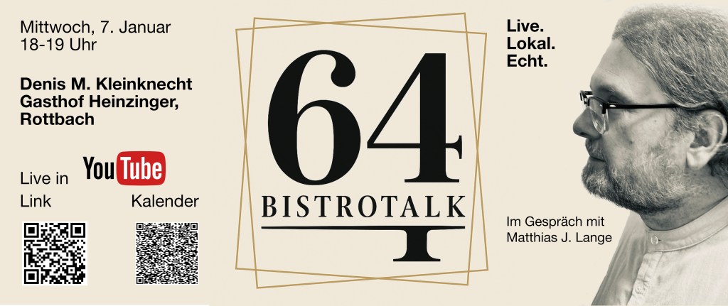 Bei meinem BistroTalk am Mittwoch, 7. Januar im Bistro SixtyFour in Maisach darf ich um 18 Uhr einen besonderen Gast begrüßen: Denis Michael Kleinknecht vom Rottbacher Gasthof Heinzinger. Ganz nach dem Motto Live. Lokal. Echt. Findet die Veranstaltung unter Publikumsbeteiligung in der Bar in der Zentrumspassage vor Publikum statt. Zudem gibt es einen moderierten Live-Stream in YouTube.