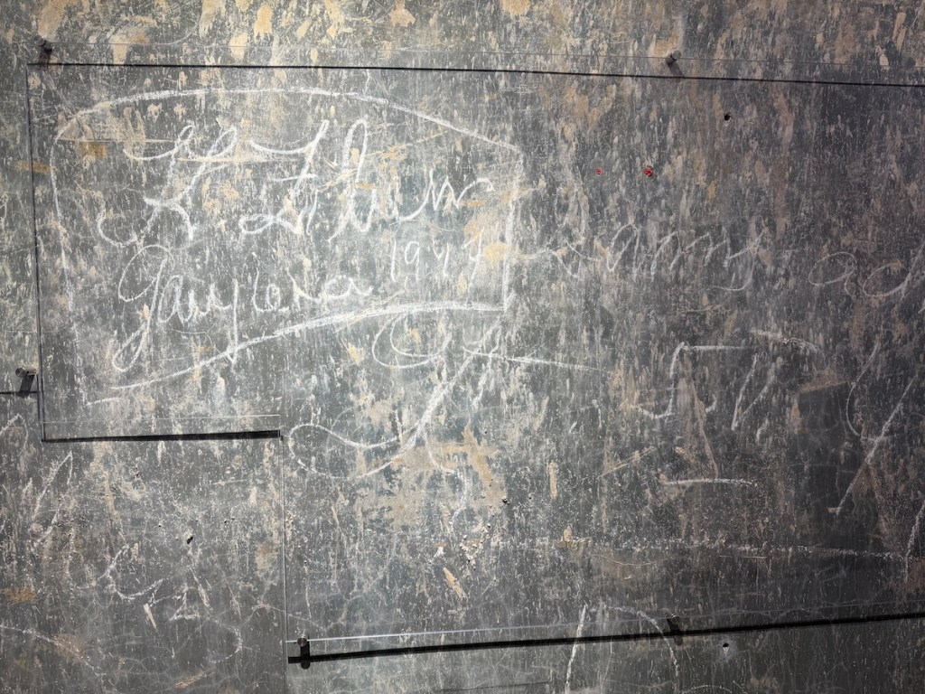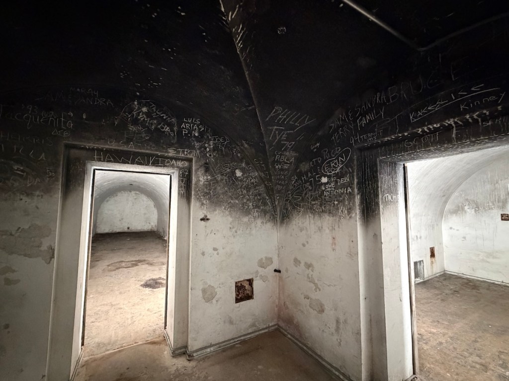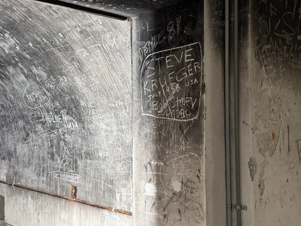 Diese Rußschichten machten es späteren Besuchern leicht, ihren eigenen Namen in die Wände zu kratzen – die Rußpartikel kontrastieren weiß, sobald man sie mit einem Schlüssel oder Stein abreibt. Auf diese Weise hinterließen in den Jahrzehnten nach Kriegsende zahllose Menschen Inschriften in den Bunkergängen – von einfachen Soldaten und Einheimischen bis hin zu Gruseltouristen und Neonazis, die heimlich in die zeitweise unbewachten Stollen eindrangen.