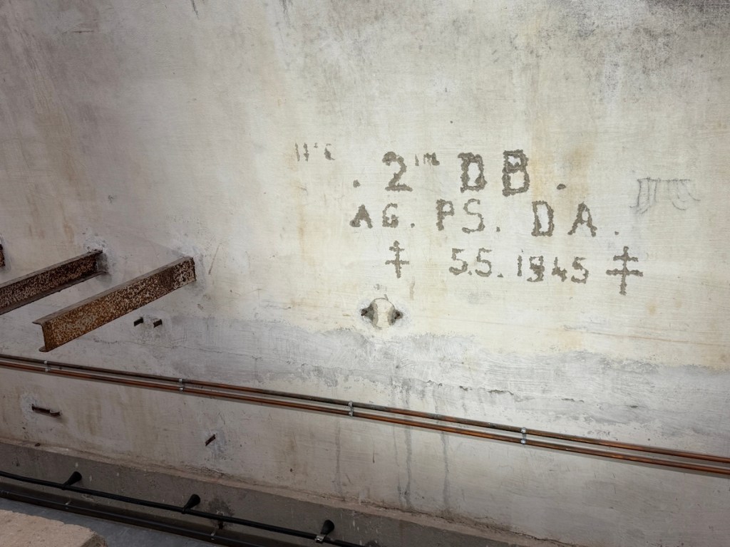 Als in den ersten Maitagen 1945 amerikanische und französische Truppen Berchtesgaden erreichten, fanden sie auf dem Obersalzberg kein aktives „Alpenfestungs“-Personal mehr vor – die Tunnel waren leer, es kam zu keinen Kämpfen. Dennoch entwickelte sich zwischen der US-Armee und der französischen 2e DB-Panzerdivision ein Wettlauf um das Prestige, Hitlers Bergresidenz als Erste zu besetzen. Schließlich hissen Amerikaner und Franzosen am 5. Mai 1945 gemeinsam ihre Flaggen über den rauchenden Trümmern auf dem Obersalzberg. In den Bunkern hinterließen drei französische Soldaten ihre Initialen („AG PS DA“) und ritzten zur Erinnerung an den Sieg ihre Einheit – „2e Division Blindée“ – sowie das Datum 5.5.1945 in eine Betonwand ein. Flankiert wurde diese Inschrift von zwei eingeritzten Lothringer Kreuzen, dem Symbol der französischen Streitkräfte im Krieg. Solche Graffiti der Alliierten markierten buchstäblich das Ende der NS-Herrschaft am Obersalzberg.