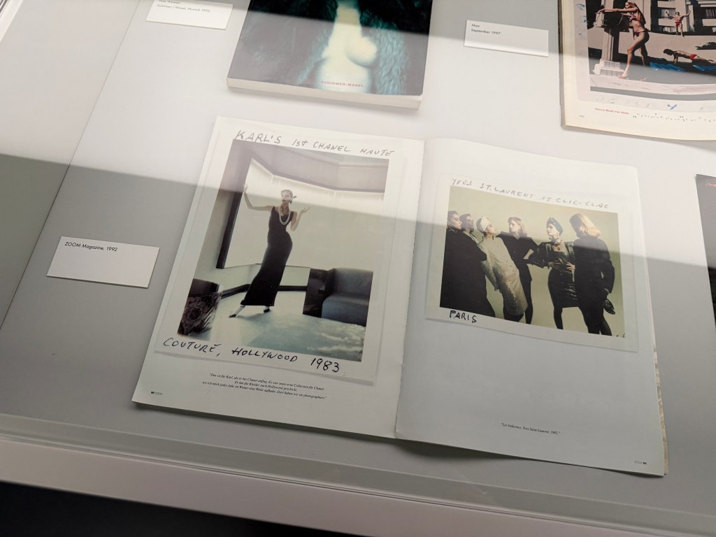Das Kunstfoyer präsentiert daher nicht nur perfekte Fotografien, sondern auch Entwürfe: kleine, quadratische SX‑70‑Prints und größere Polacolor‑Abzüge, auf denen Newton mit Filzstift Notizen zu Model, Auftraggeber, Aufnahmeort oder Datumsangaben hinterließ. Diese handschriftlichen Bemerkungen und Gebrauchsspuren verleihen den Bildern eine intime, arbeitsnahe Aura. Für Newton markierten viele Polaroids den Anfang eines später berühmt gewordenen Bildes; anhand der gegenübergestellten Serien erkennt man den Prozess vom spontanen Entwurf zum finalen Icon.