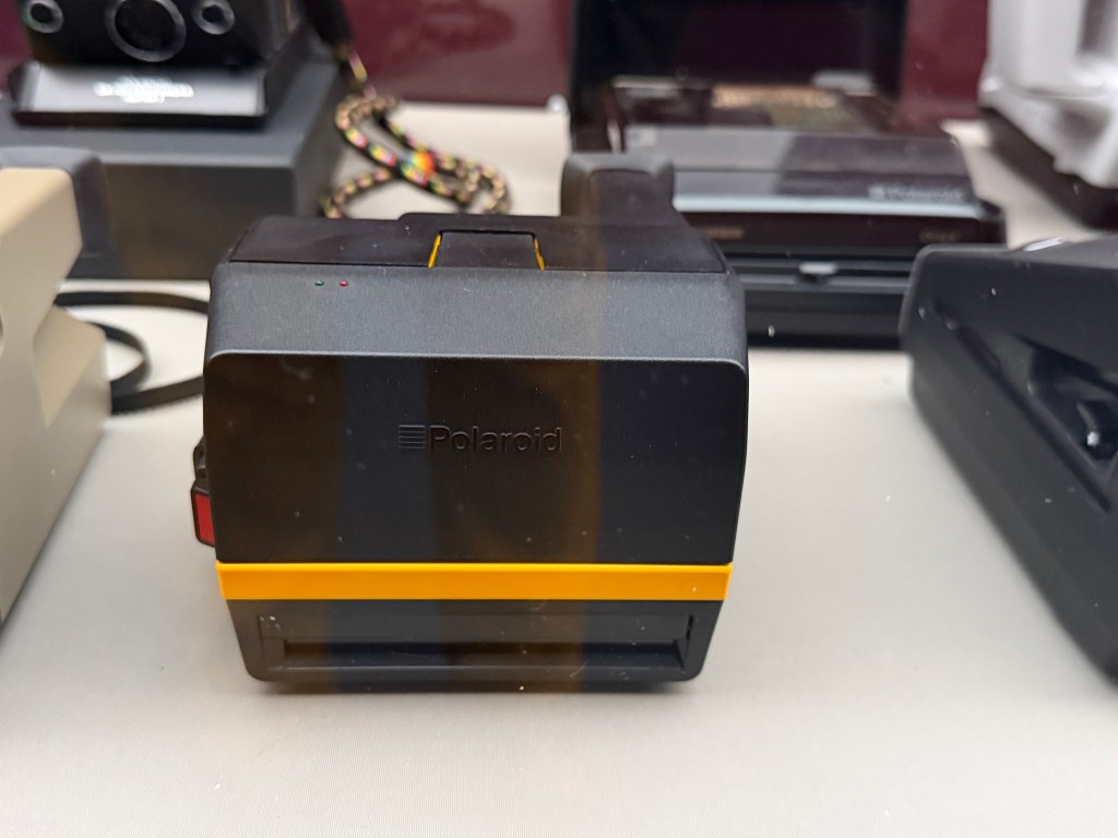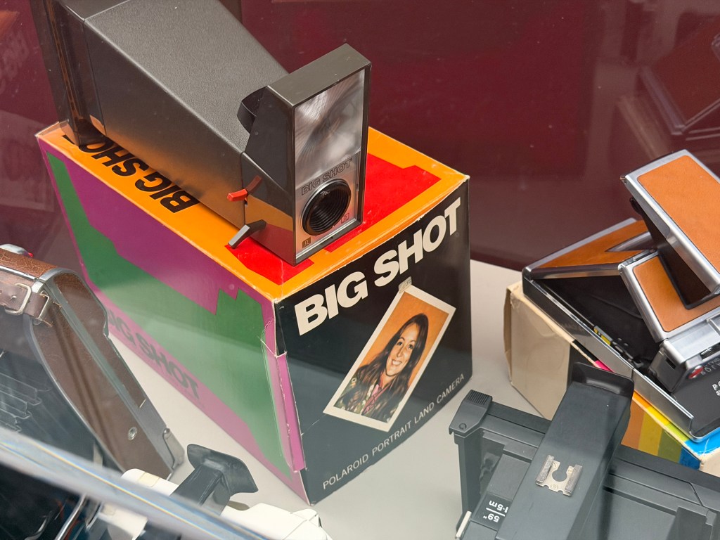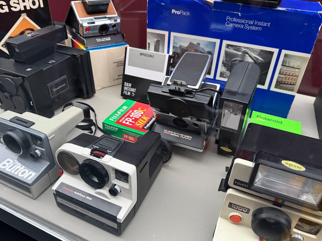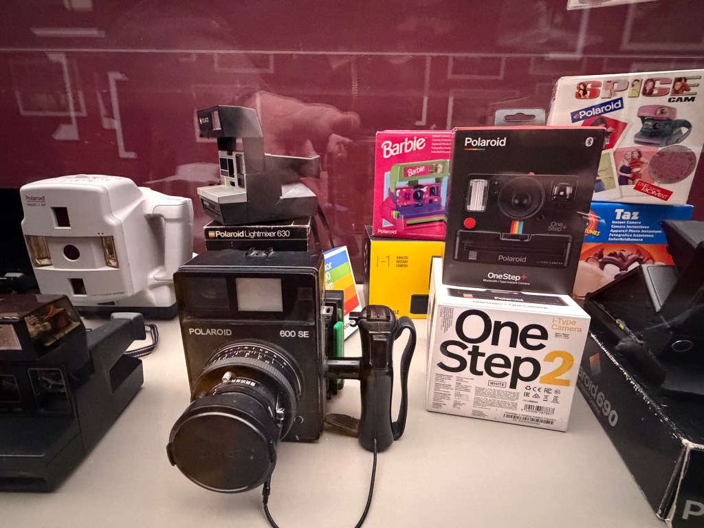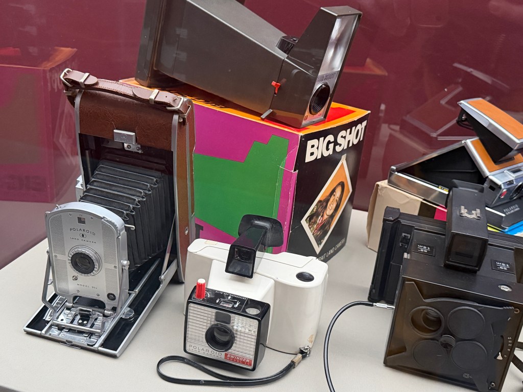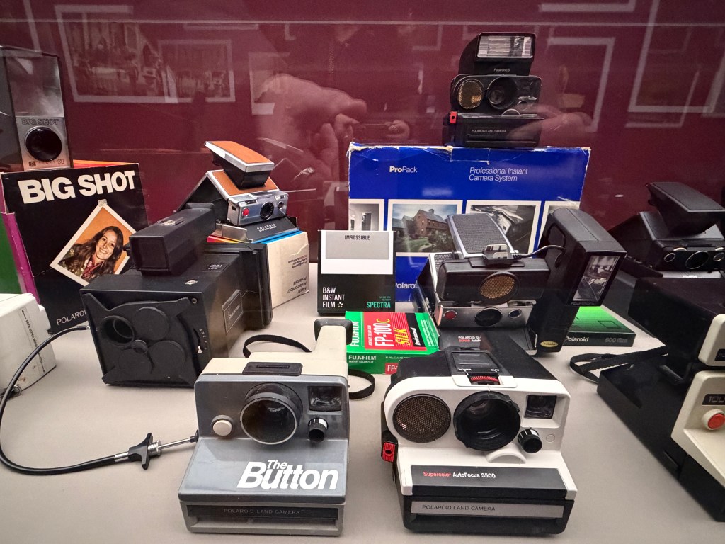 Polaroid produzierte zahlreiche Kameramodelle, von denen einige in der Ausstellung zu sehen sind. Land Cameras wie die Model 95 (1948) erforderten noch das manuelle Abziehen des Positivs und das Auftragen einer Fixierpaste; später folgte das Modell SX‑70, das dank einer klappbaren Spiegelreflexkonstruktion und integrierter Filmkassette mit Batterie den Entwicklervorgang automatisierte und beliebig oft wiederholbar machte. Die Kameras verfügten über einen 116‑mm‑Glaslinsensatz, manuellen oder später sonar‑gesteuerten Autofokus und eine Belichtungsautomatik. Die Filme selbst waren quadratisch (rund 79 × 79 mm), wiesen eine Filmempfindlichkeit von ASA 150 auf und enthielten alle Chemikalien für Entwicklung und Fixierung. In den 1980er‑Jahren erschienen robuste „Box“-Kameras der 600‑Serie mit höherer Filmempfindlichkeit; sie waren einfacher und sollten den Massenmarkt bedienen.