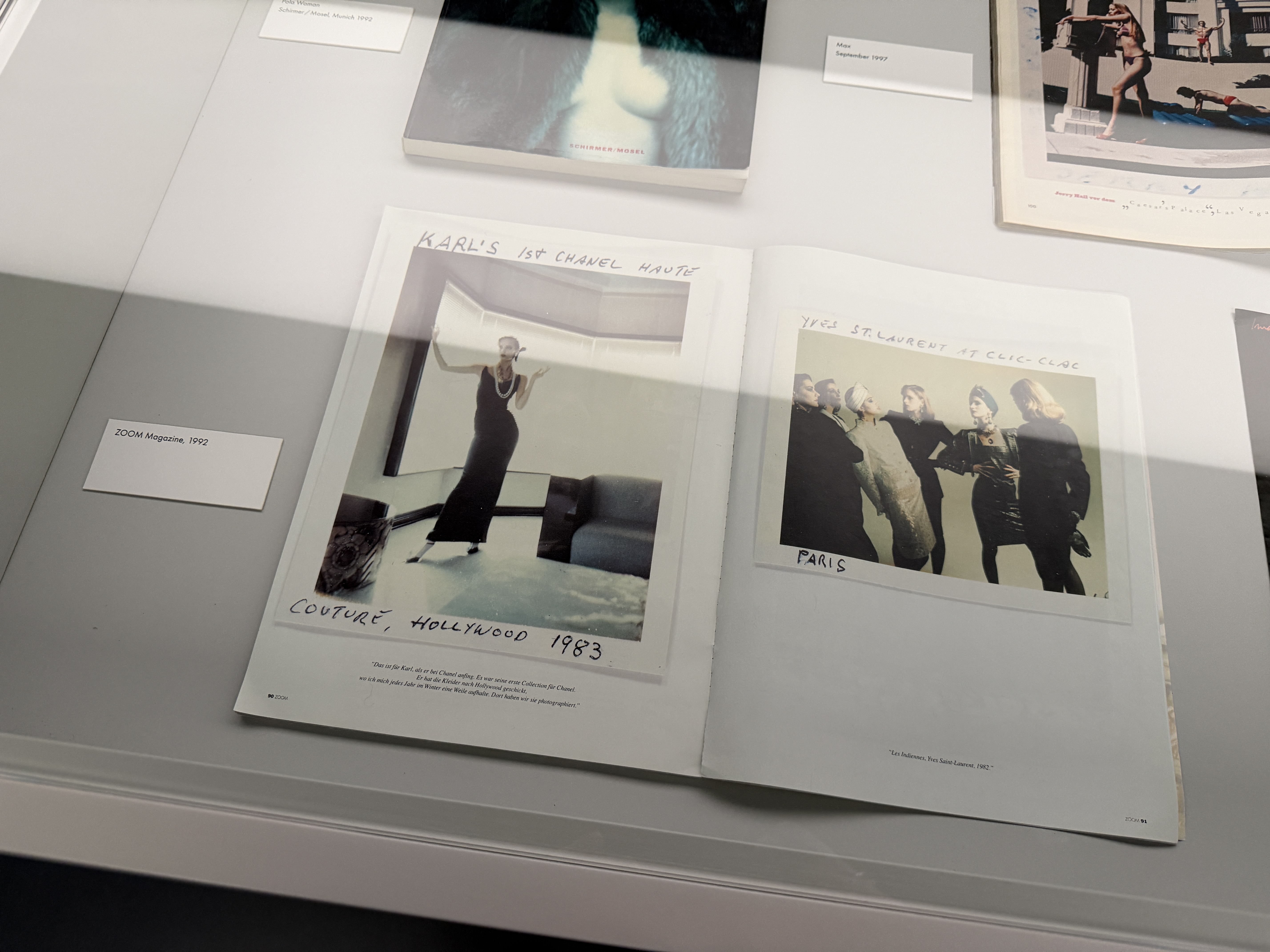 Das Kunstfoyer präsentiert daher nicht nur perfekte Fotografien, sondern auch Entwürfe: kleine, quadratische SX‑70‑Prints und größere Polacolor‑Abzüge, auf denen Newton mit Filzstift Notizen zu Model, Auftraggeber, Aufnahmeort oder Datumsangaben hinterließ. Diese handschriftlichen Bemerkungen und Gebrauchsspuren verleihen den Bildern eine intime, arbeitsnahe Aura. Für Newton markierten viele Polaroids den Anfang eines später berühmt gewordenen Bildes; anhand der gegenübergestellten Serien erkennt man den Prozess vom spontanen Entwurf zum finalen Icon.