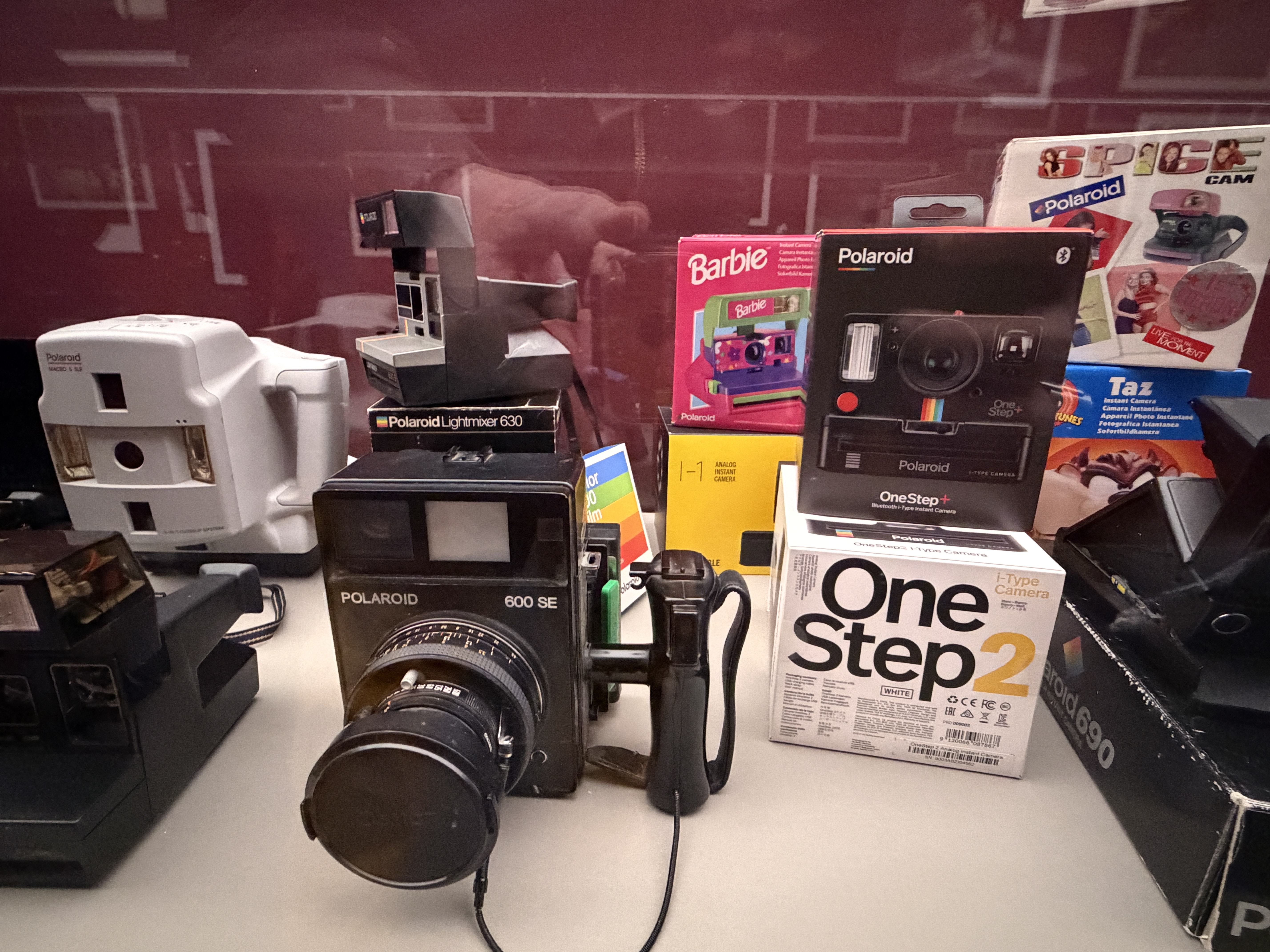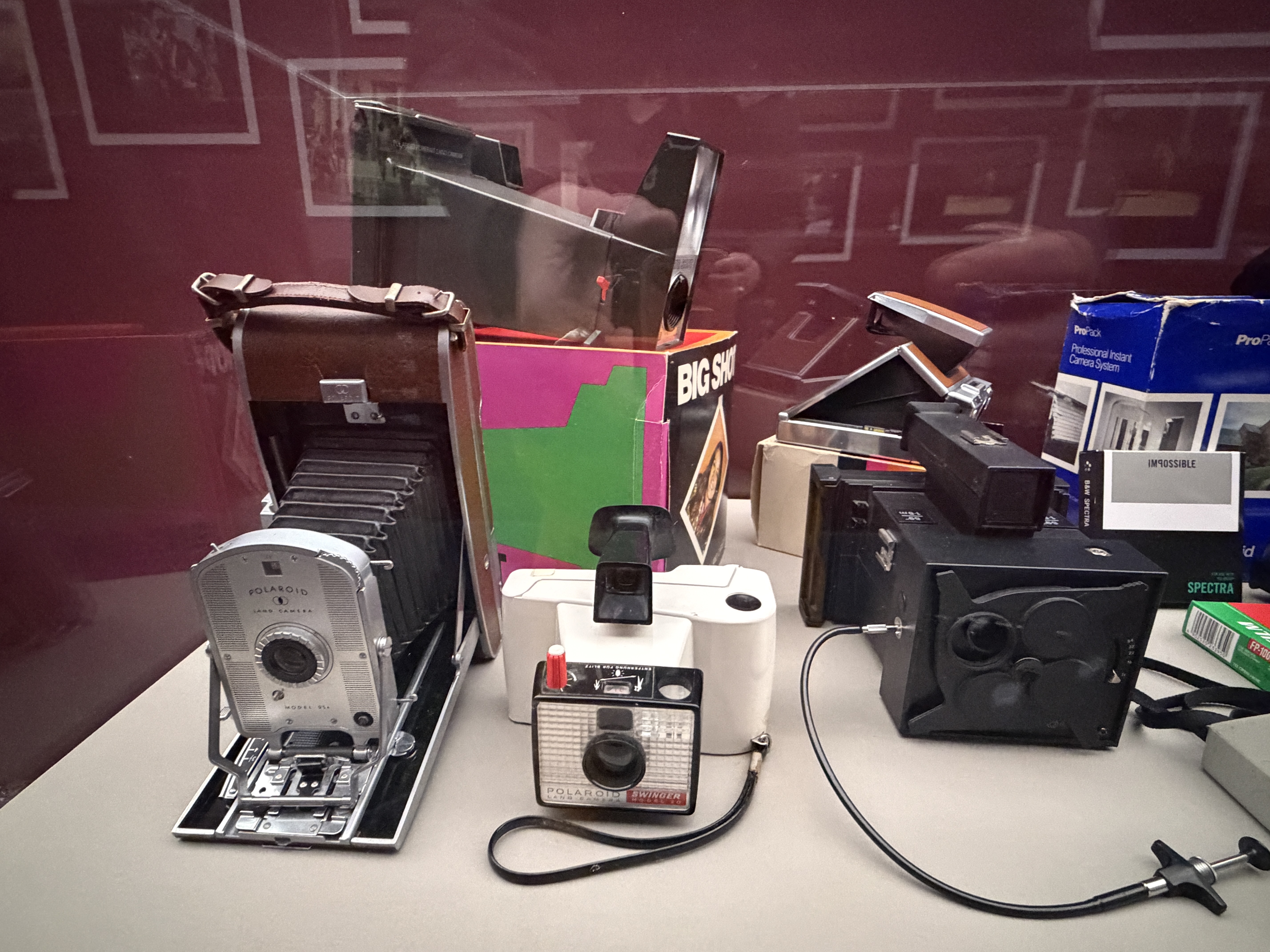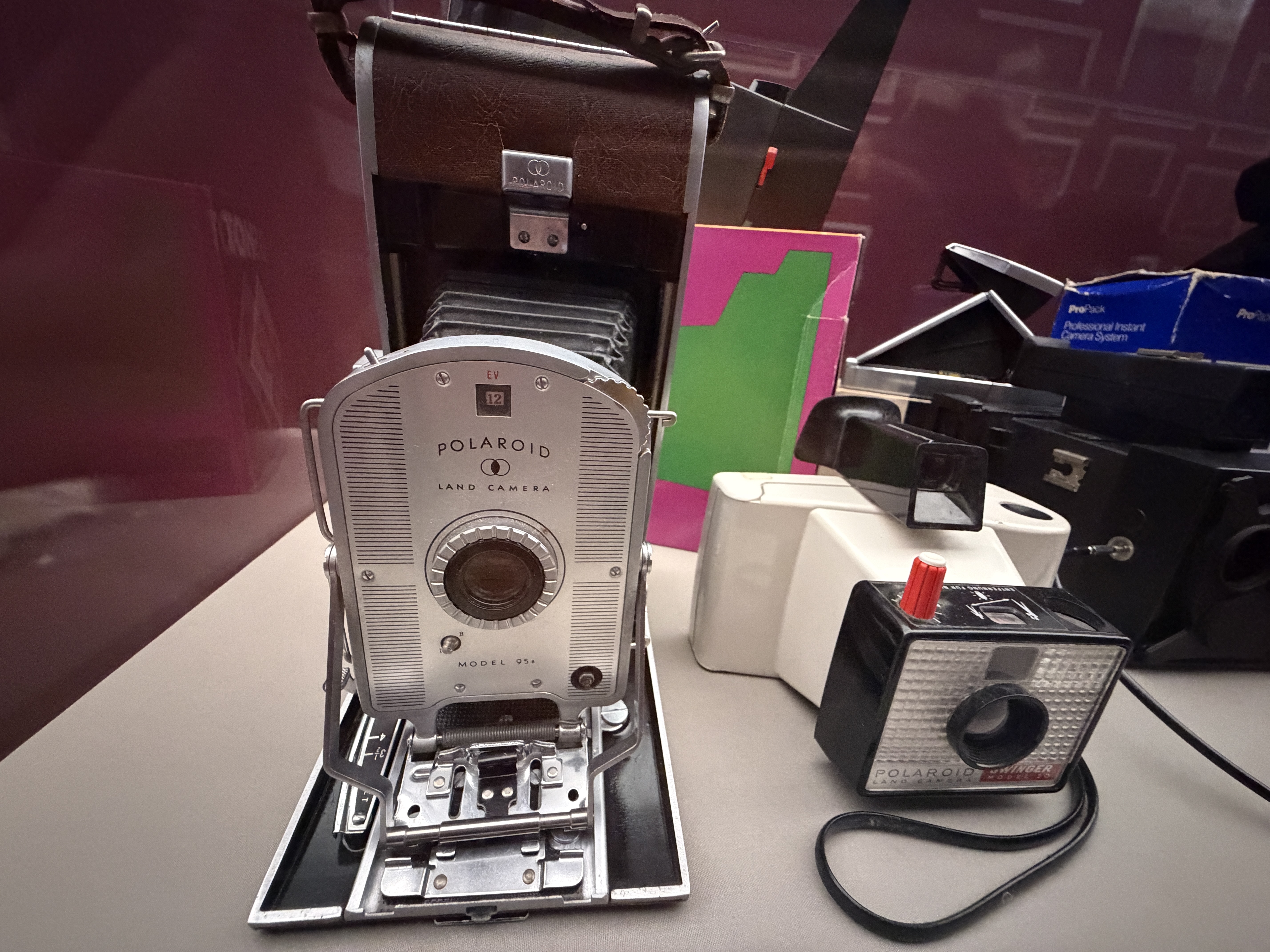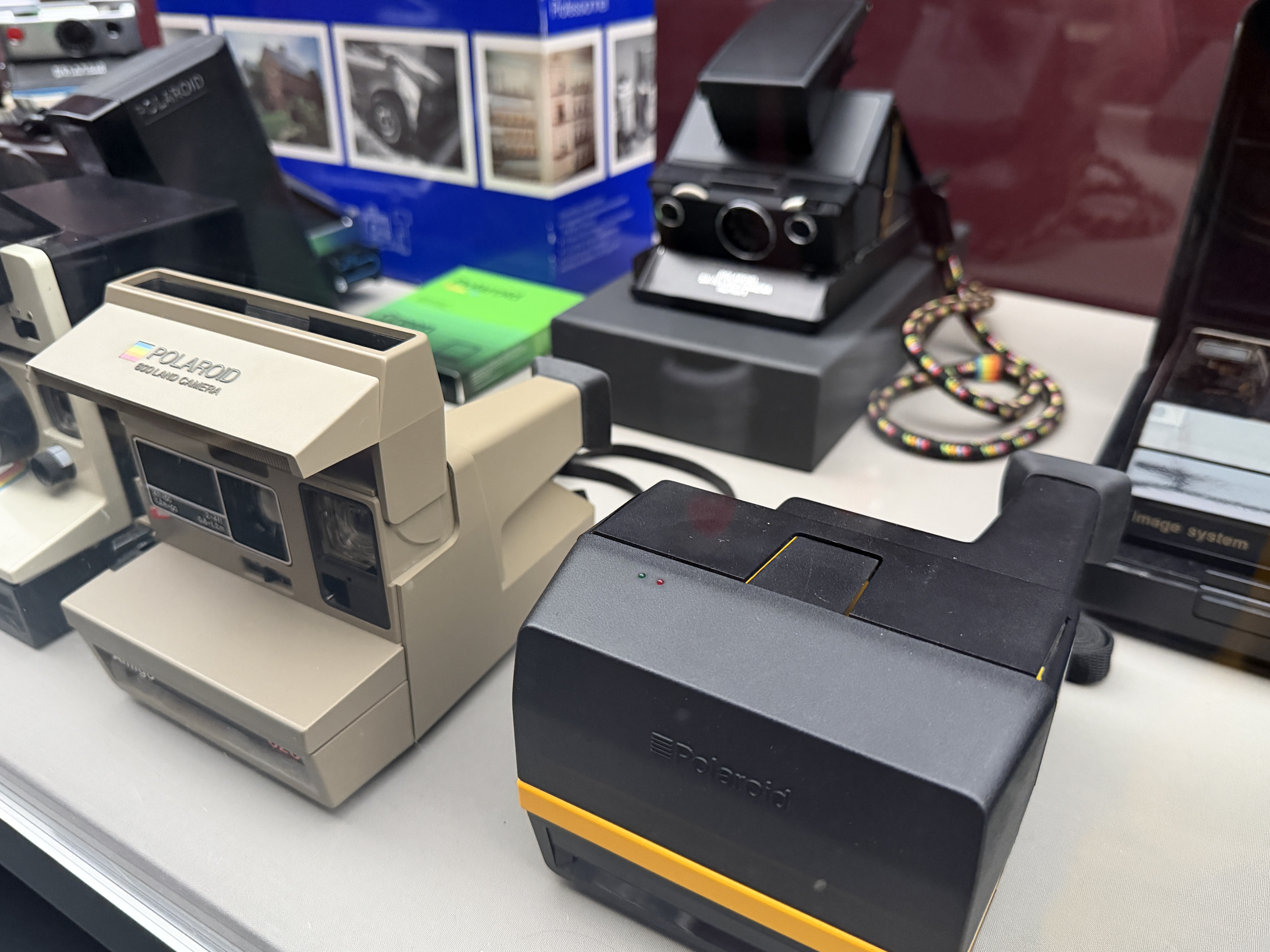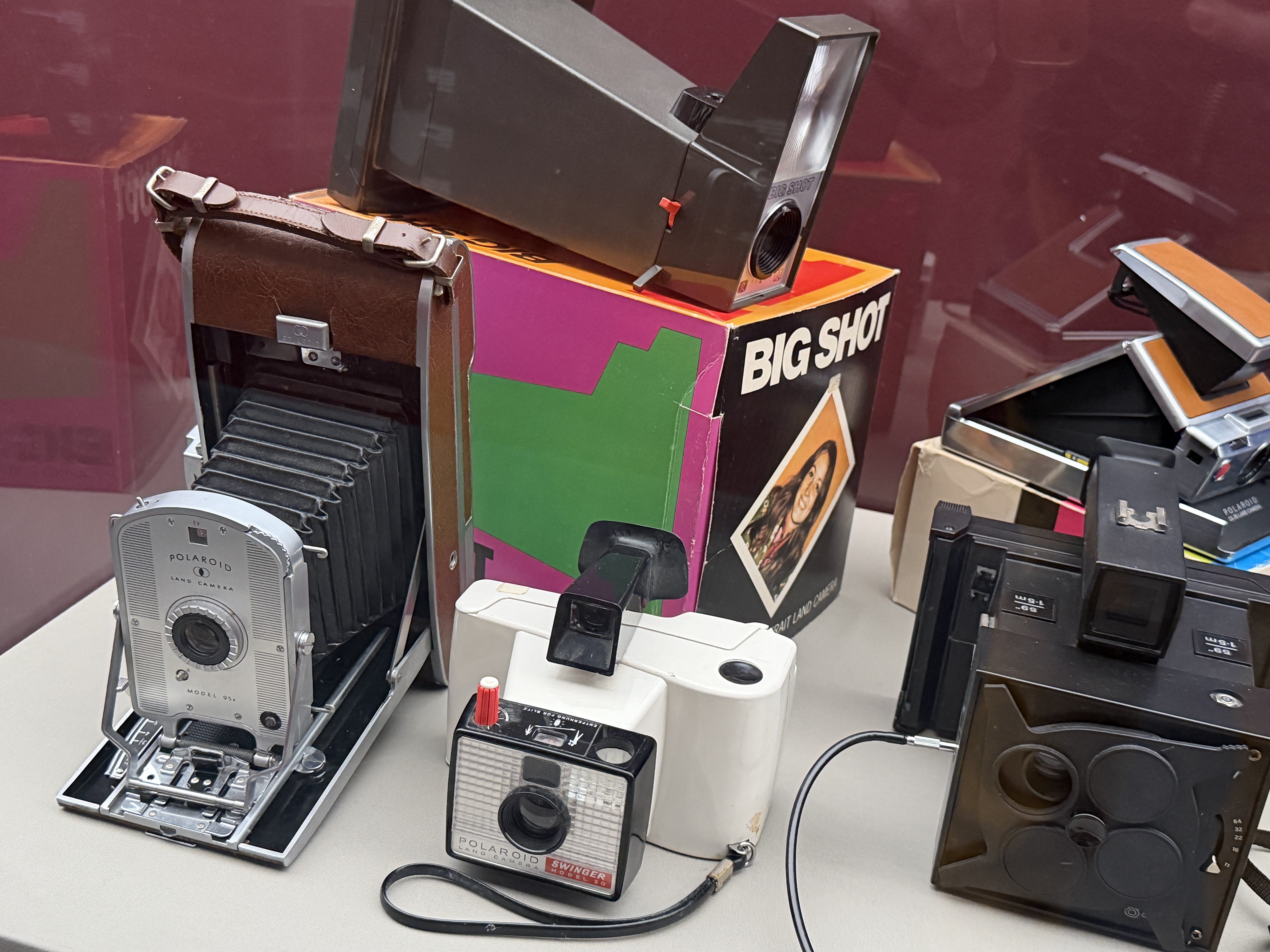Polaroid produzierte zahlreiche Kameramodelle, von denen einige in der Ausstellung zu sehen sind. Land Cameras wie die Model 95 (1948) erforderten noch das manuelle Abziehen des Positivs und das Auftragen einer Fixierpaste; später folgte das Modell SX‑70, das dank einer klappbaren Spiegelreflexkonstruktion und integrierter Filmkassette mit Batterie den Entwicklervorgang automatisierte und beliebig oft wiederholbar machte. Die Kameras verfügten über einen 116‑mm‑Glaslinsensatz, manuellen oder später sonar‑gesteuerten Autofokus und eine Belichtungsautomatik. Die Filme selbst waren quadratisch (rund 79 × 79 mm), wiesen eine Filmempfindlichkeit von ASA 150 auf und enthielten alle Chemikalien für Entwicklung und Fixierung. In den 1980er‑Jahren erschienen robuste „Box“-Kameras der 600‑Serie mit höherer Filmempfindlichkeit; sie waren einfacher und sollten den Massenmarkt bedienen.