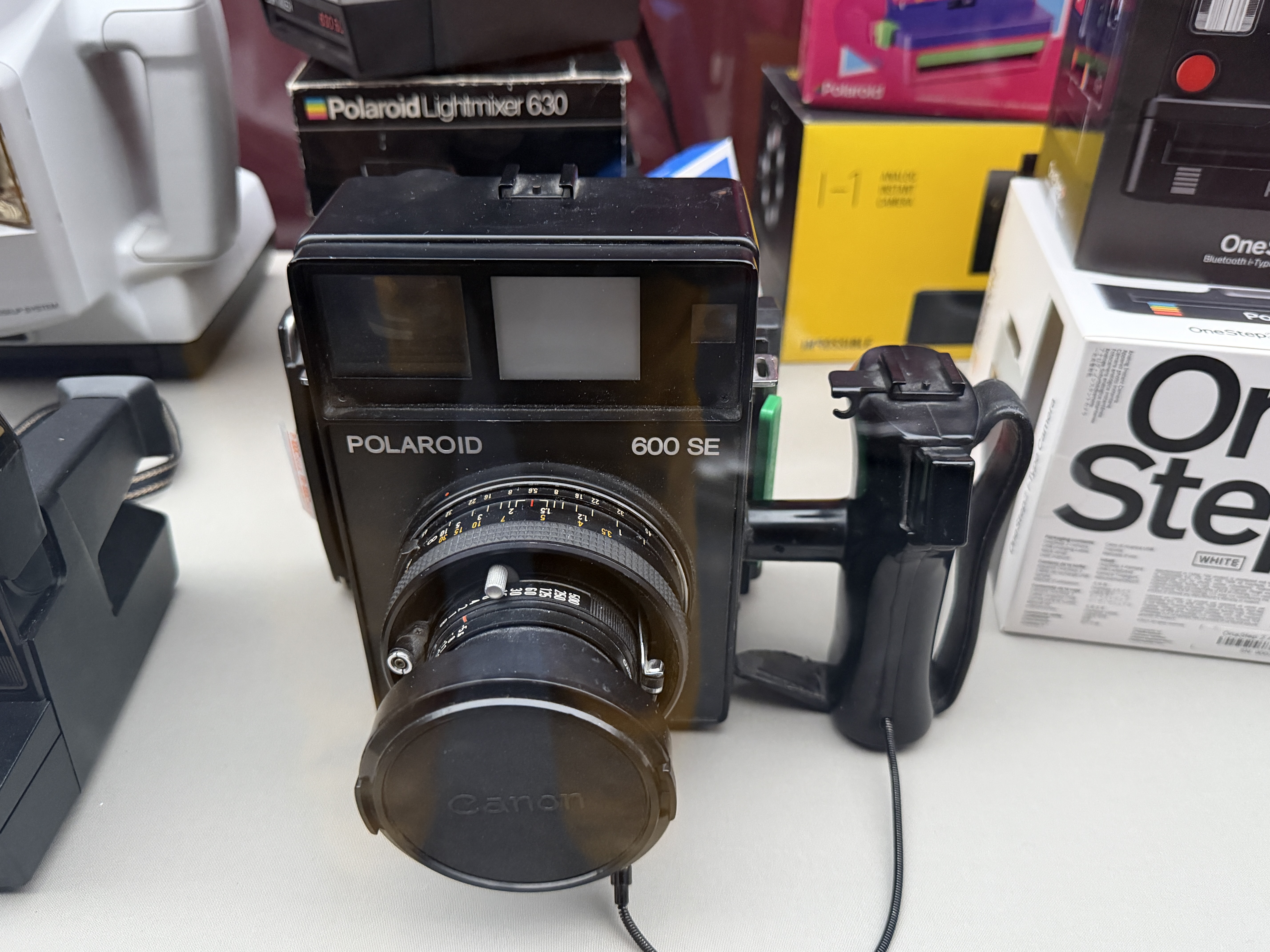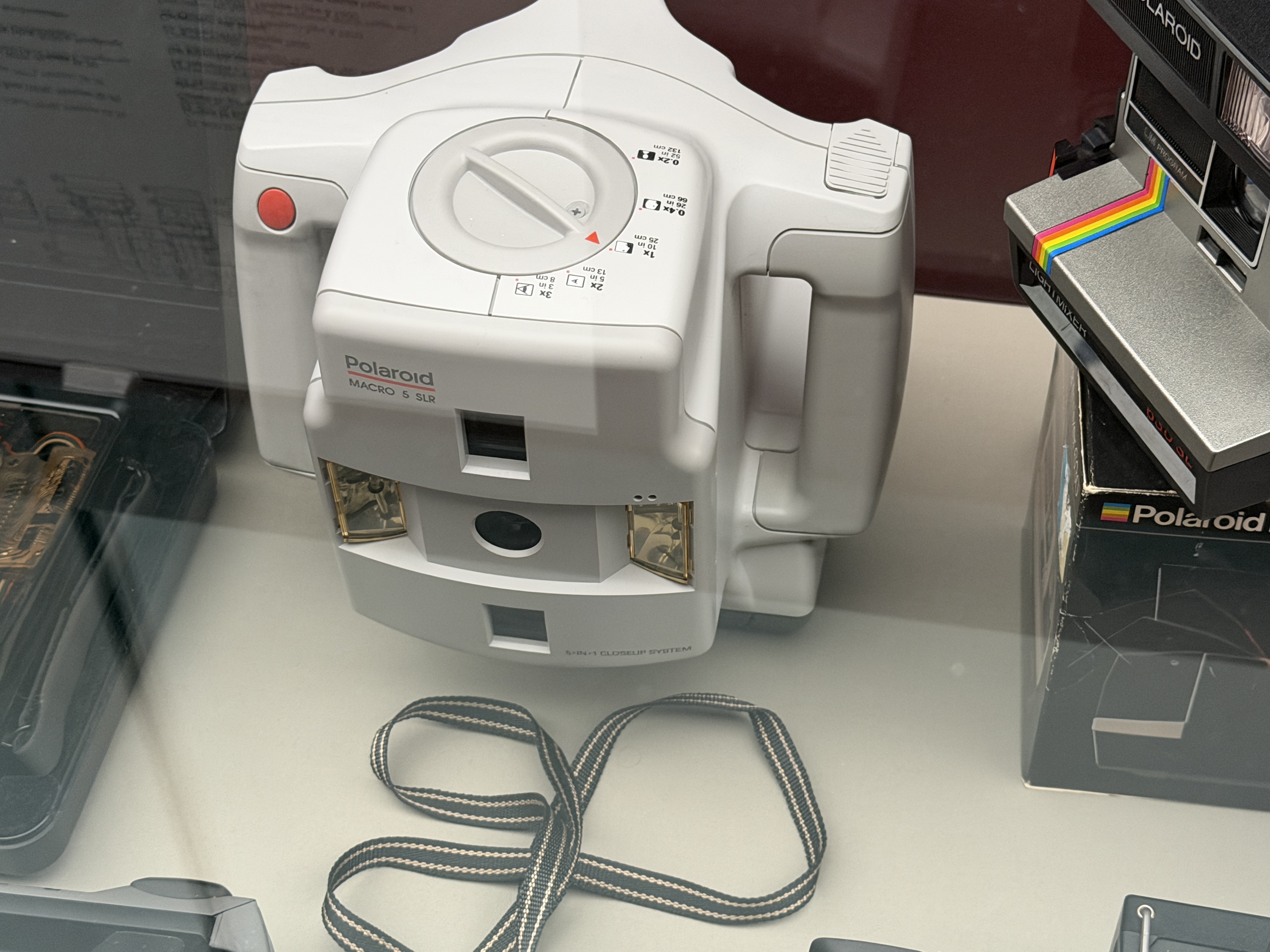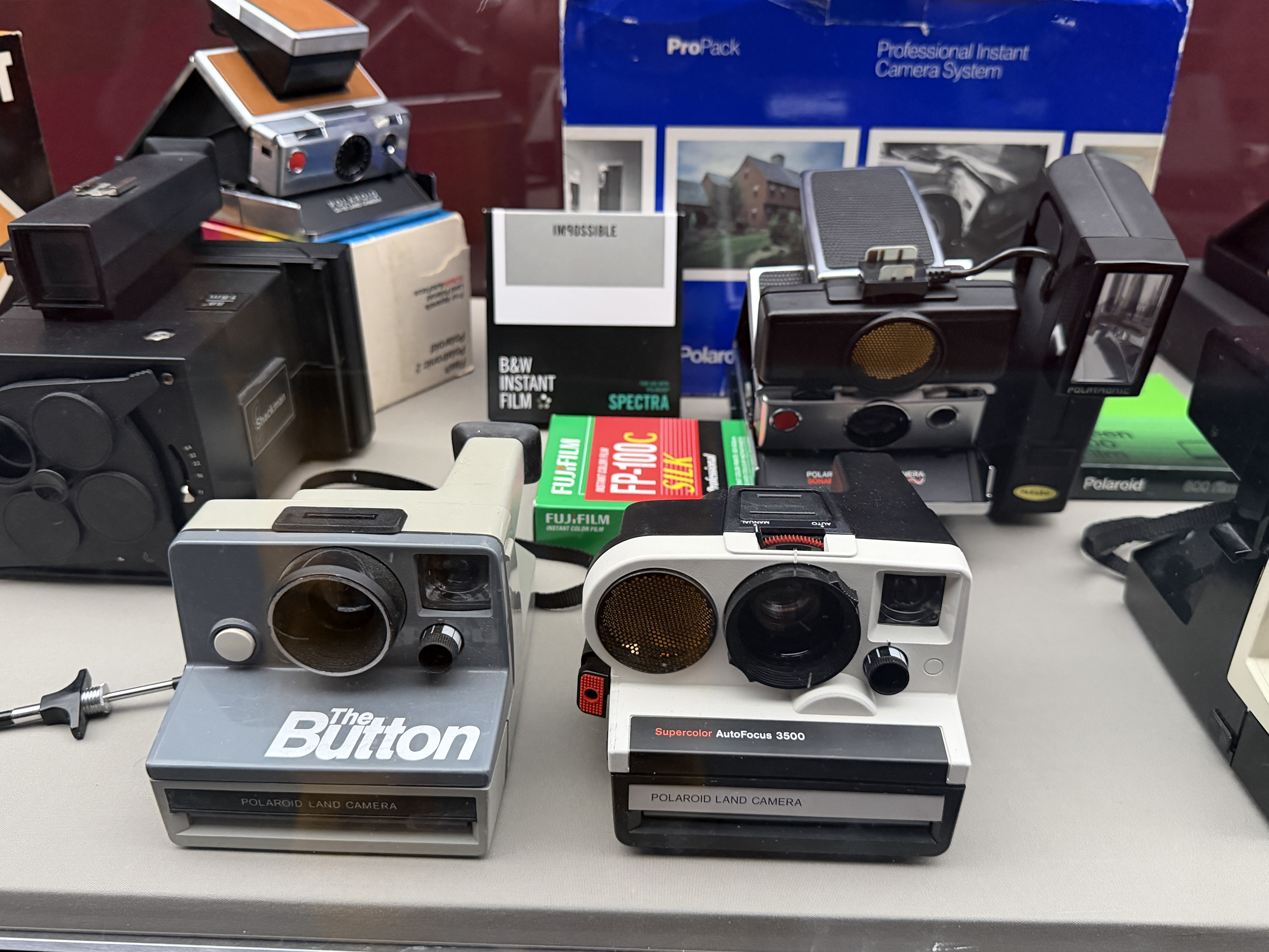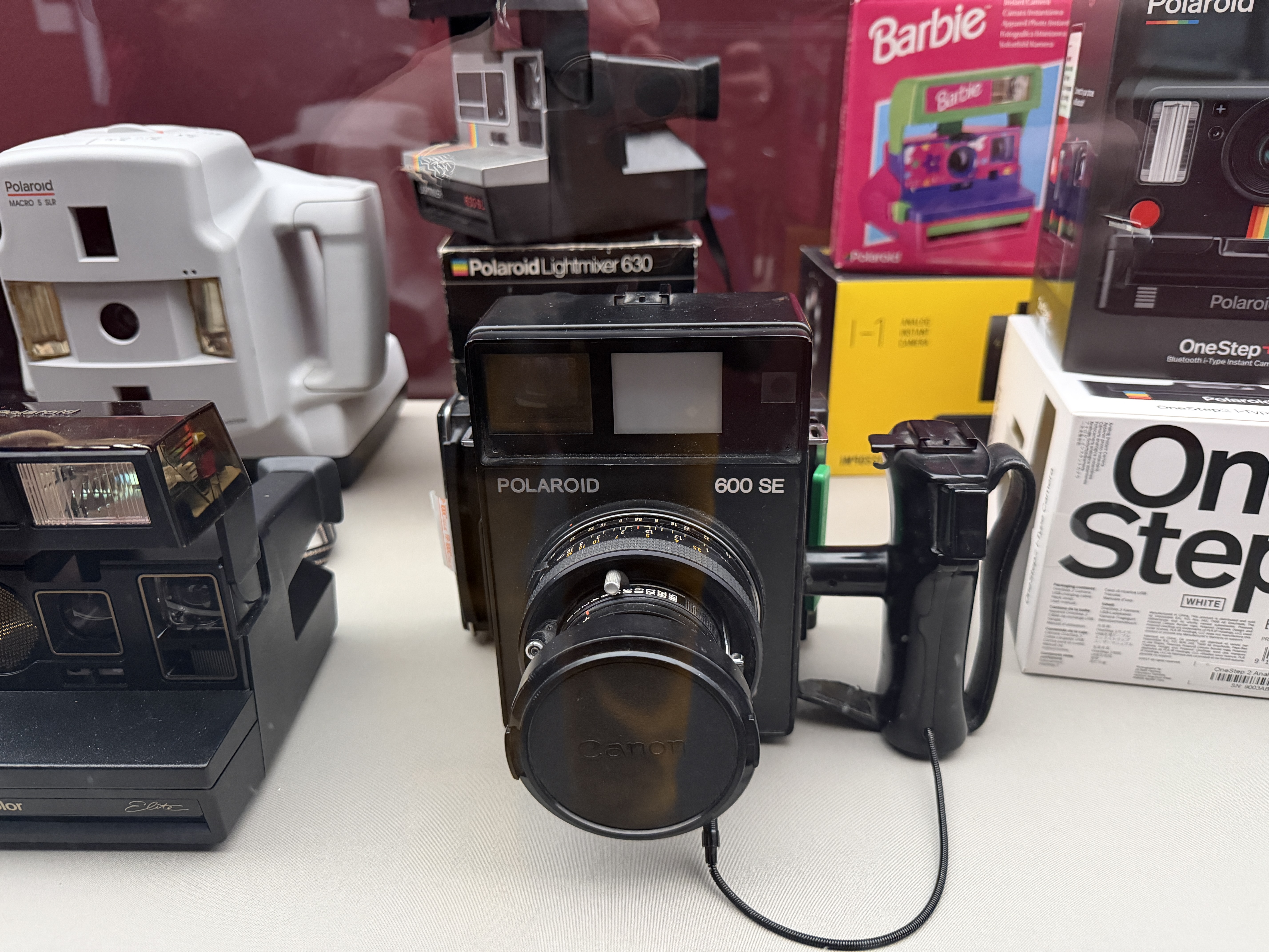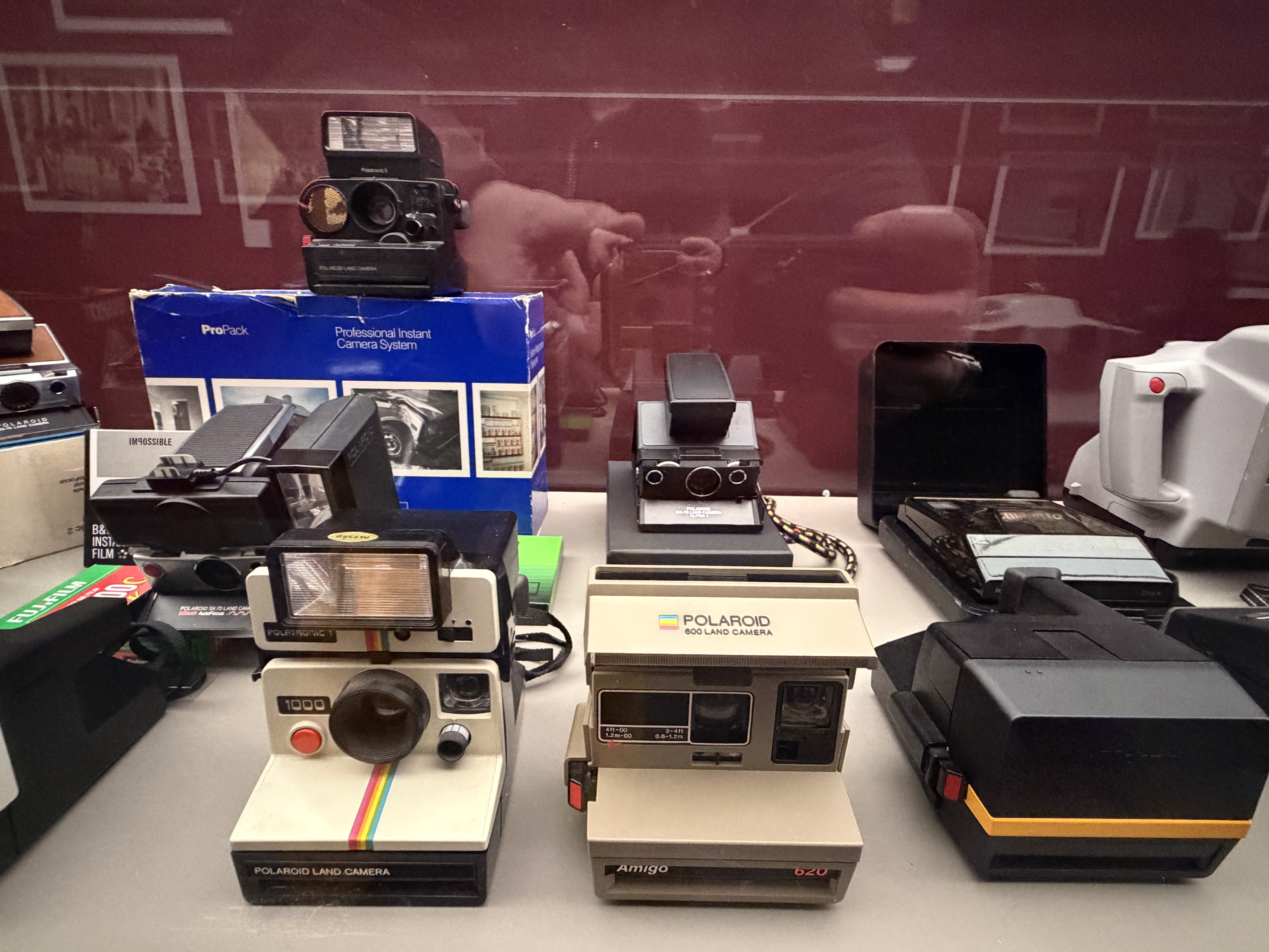 Polaroid produzierte zahlreiche Kameramodelle, von denen einige in der Ausstellung zu sehen sind. Land Cameras wie die Model 95 (1948) erforderten noch das manuelle Abziehen des Positivs und das Auftragen einer Fixierpaste; später folgte das Modell SX‑70, das dank einer klappbaren Spiegelreflexkonstruktion und integrierter Filmkassette mit Batterie den Entwicklervorgang automatisierte und beliebig oft wiederholbar machte. Die Kameras verfügten über einen 116‑mm‑Glaslinsensatz, manuellen oder später sonar‑gesteuerten Autofokus und eine Belichtungsautomatik. Die Filme selbst waren quadratisch (rund 79 × 79 mm), wiesen eine Filmempfindlichkeit von ASA 150 auf und enthielten alle Chemikalien für Entwicklung und Fixierung. In den 1980er‑Jahren erschienen robuste „Box“-Kameras der 600‑Serie mit höherer Filmempfindlichkeit; sie waren einfacher und sollten den Massenmarkt bedienen.