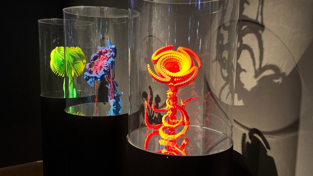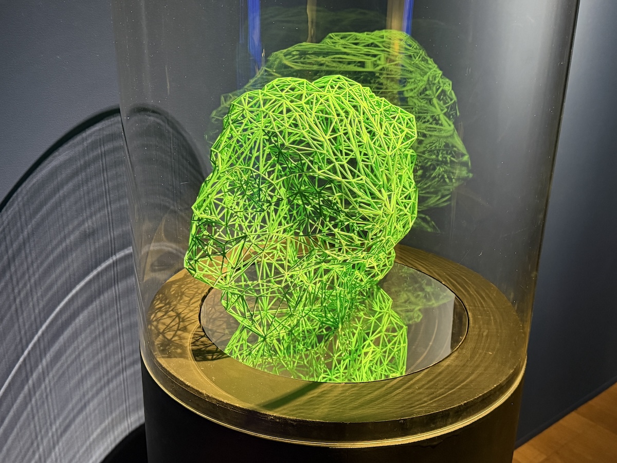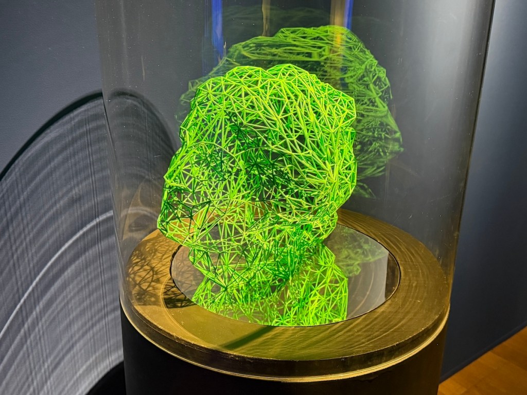 Auf rund 120 Arbeiten – von frühen Computerbildern bis zu jüngsten, KI-gestützten Projekten – entfaltet sich ein Parcours, der digitale Bildwelten konsequent mit analogen Bezügen zur Kunst- und Naturgeschichte verschränkt. Skulpturen und Zeichnungen, die mithilfe von 3D-Druck und Robotik entstehen, stehen neben Videos, maschinell produzierten Stickereien und großformatigen Projektionen und veranschaulichen, wie sehr Chevalier die Formfindung an Software, Algorithmen und automatisierte Fertigungsprozesse auslagert. Die räumlich angelegten, immersiven Installationen bilden das Zentrum der Schau: Hier generieren eigens entwickelte Programme in Echtzeit immer neue Bildkonstellationen, deren Ablauf zwar auf klar definierten Code-Strukturen beruht, aber bewusst mit Zufallsparametern arbeitet.