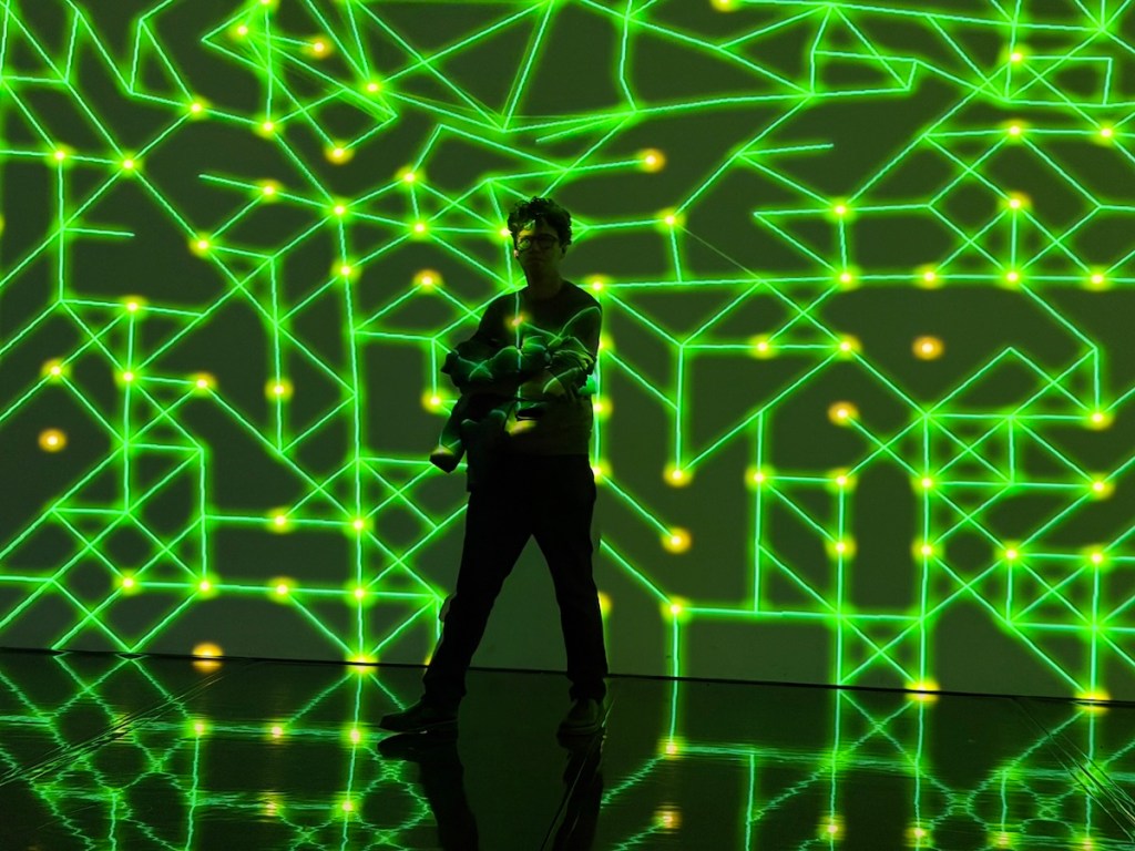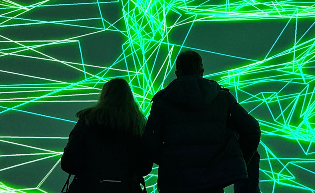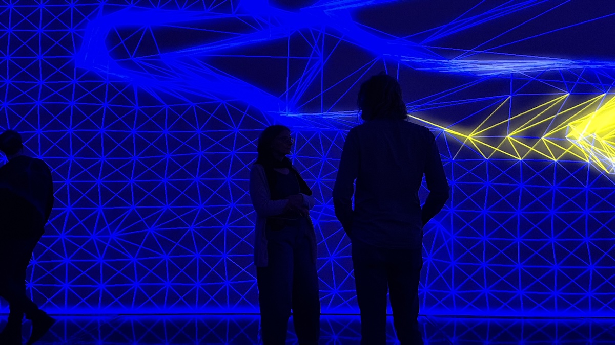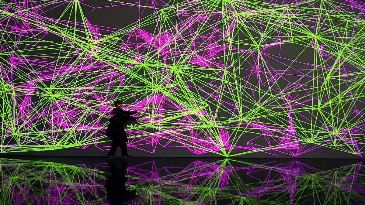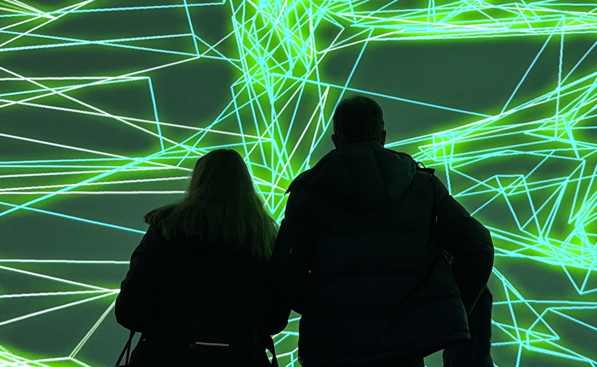Zu den interaktiven Highlights von „Digital by Nature“ in der Kunsthalle München zählen vor allem die raumgreifenden, generativen Installationen, die auf Körperbewegungen reagieren. Besucherinnen und Besucher bewegen sich durch projizierte Bildwelten, während Sensoren ihre Position registrieren und die Algorithmen daraufhin Farben, Formen und Bewegungsrichtungen der digitalen Muster verändern – jede Bewegung schreibt so die Bildsequenz ein Stück weit neu.