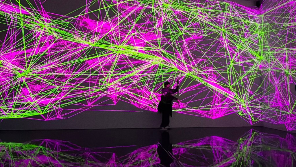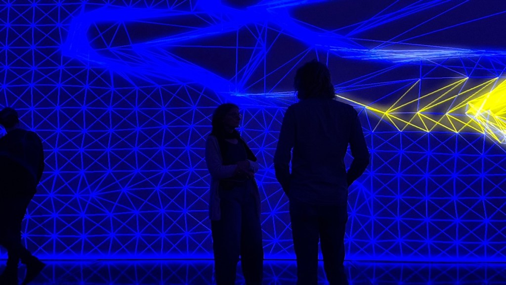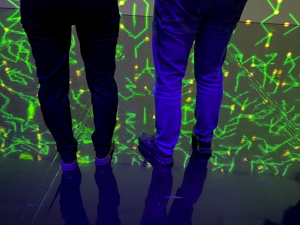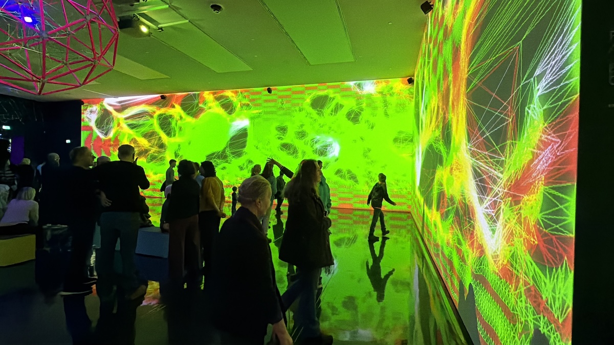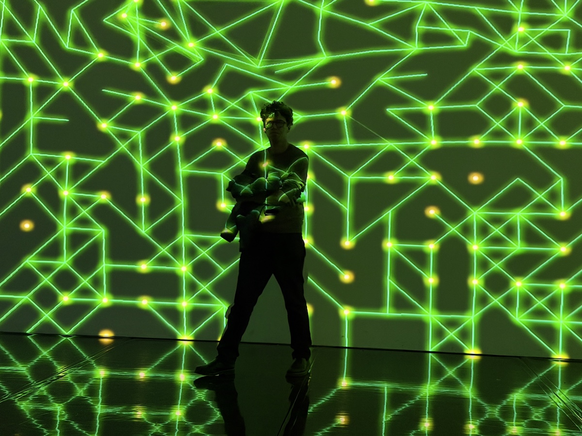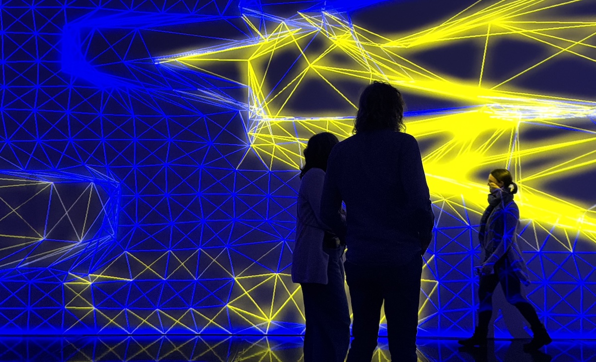 Zu den interaktiven Highlights von „Digital by Nature“ in der Kunsthalle München zählen vor allem die raumgreifenden, generativen Installationen, die auf Körperbewegungen reagieren. Besucherinnen und Besucher bewegen sich durch projizierte Bildwelten, während Sensoren ihre Position registrieren und die Algorithmen daraufhin Farben, Formen und Bewegungsrichtungen der digitalen Muster verändern – jede Bewegung schreibt so die Bildsequenz ein Stück weit neu.