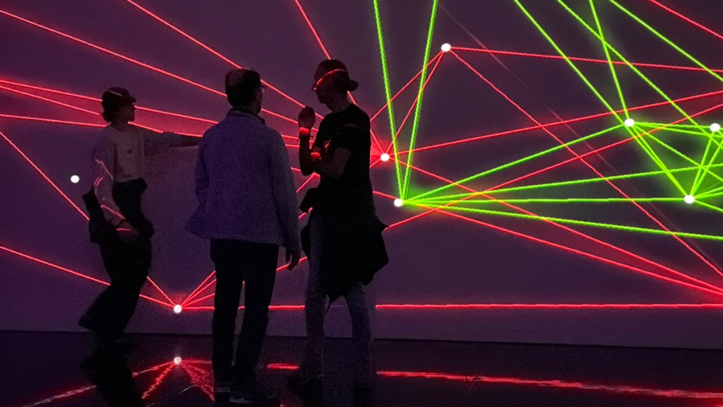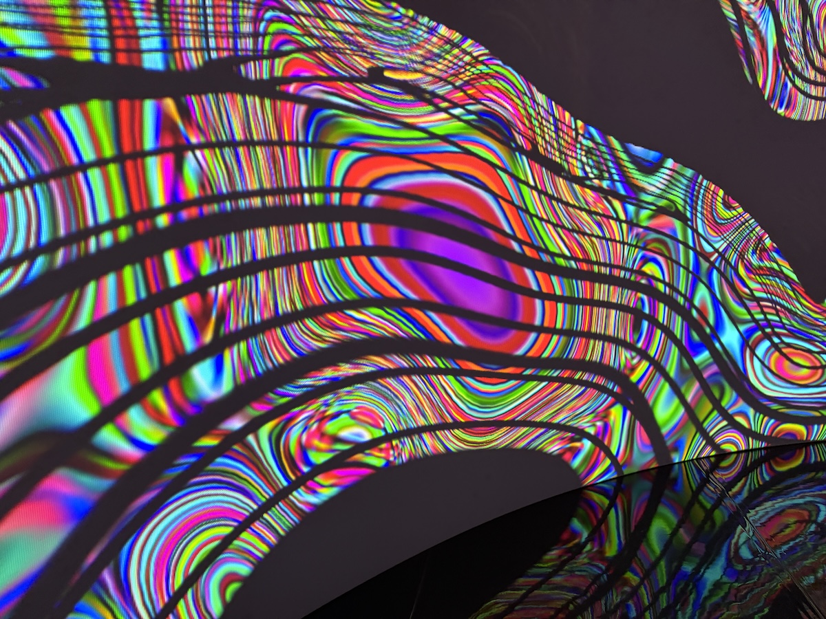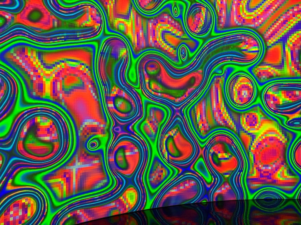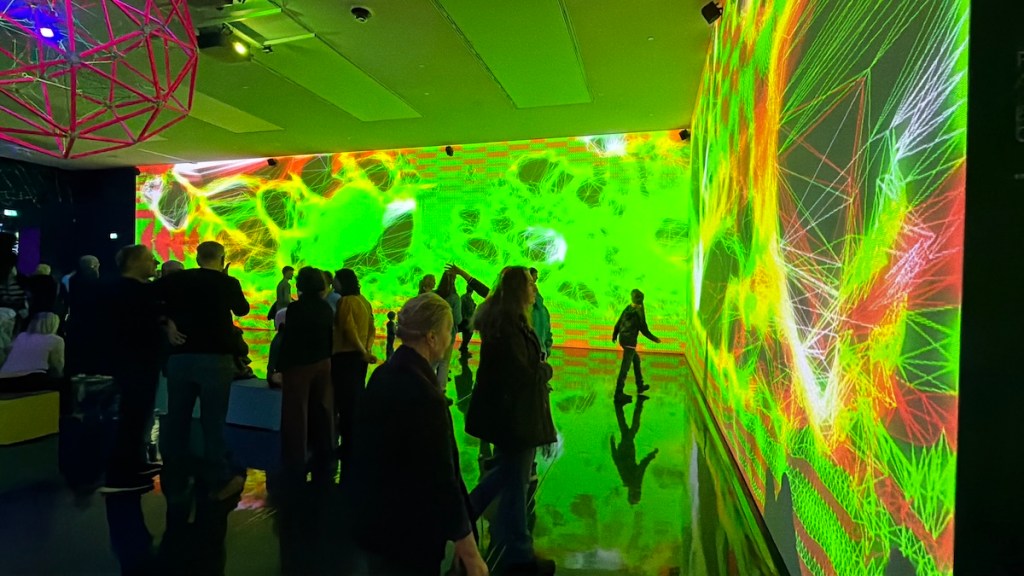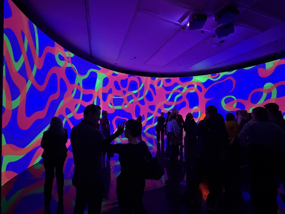 Zu den interaktiven Highlights von „Digital by Nature“ in der Kunsthalle München zählen vor allem die raumgreifenden, generativen Installationen, die auf Körperbewegungen reagieren. Besucherinnen und Besucher bewegen sich durch projizierte Bildwelten, während Sensoren ihre Position registrieren und die Algorithmen daraufhin Farben, Formen und Bewegungsrichtungen der digitalen Muster verändern – jede Bewegung schreibt so die Bildsequenz ein Stück weit neu.