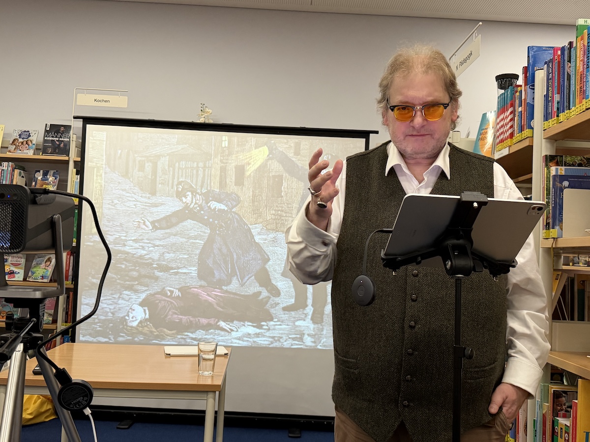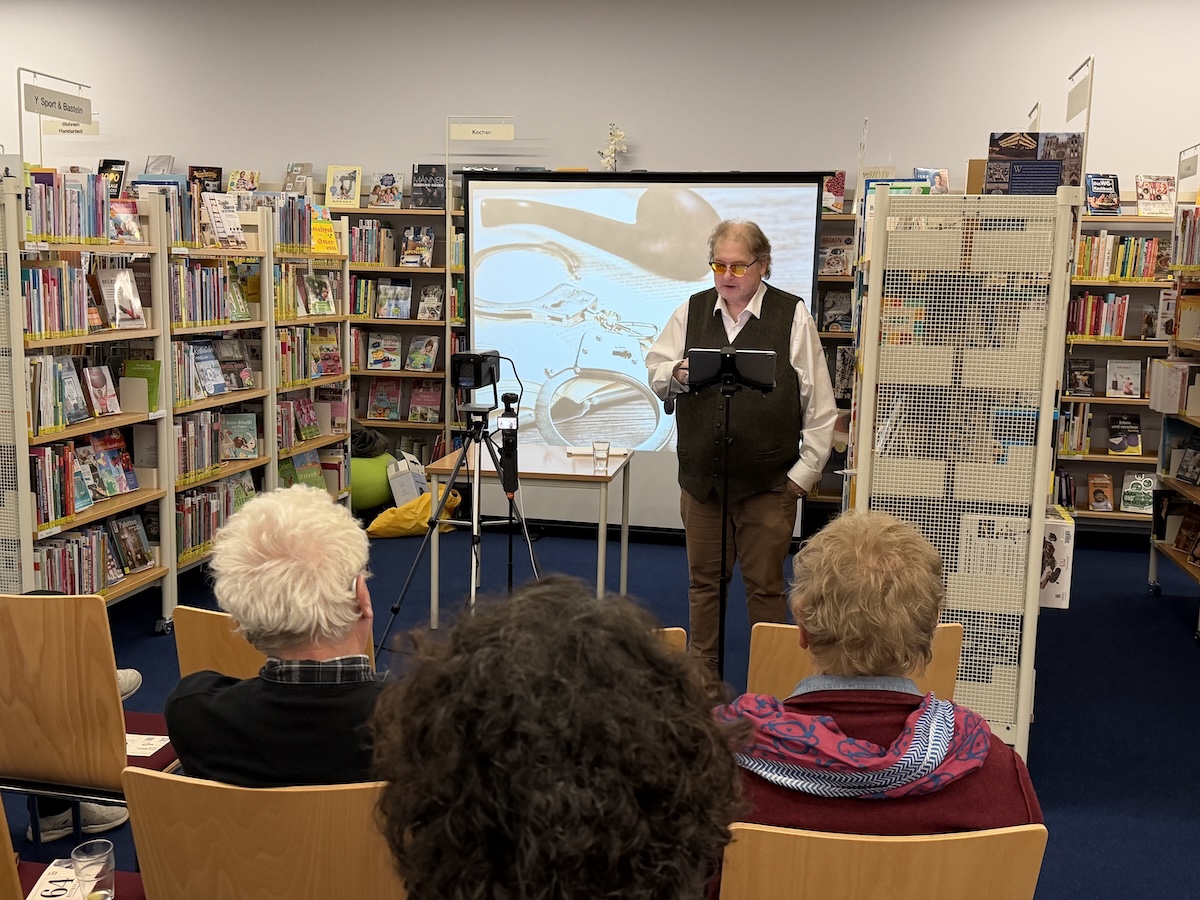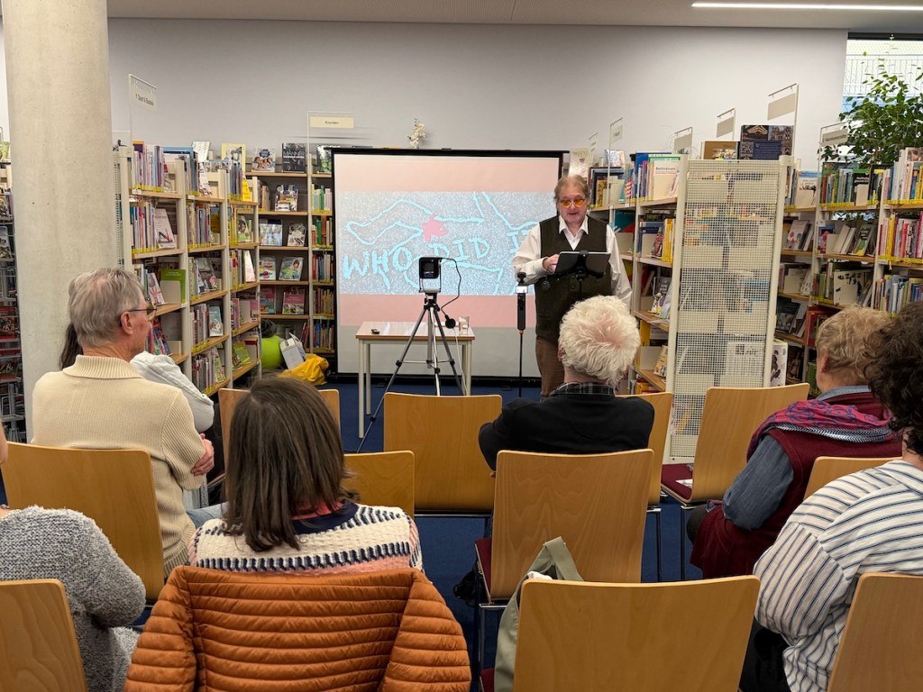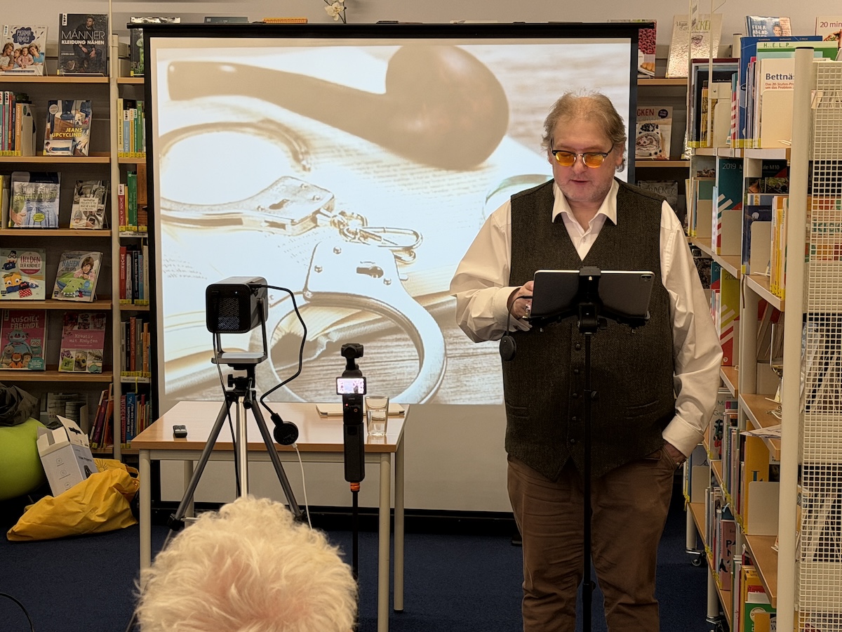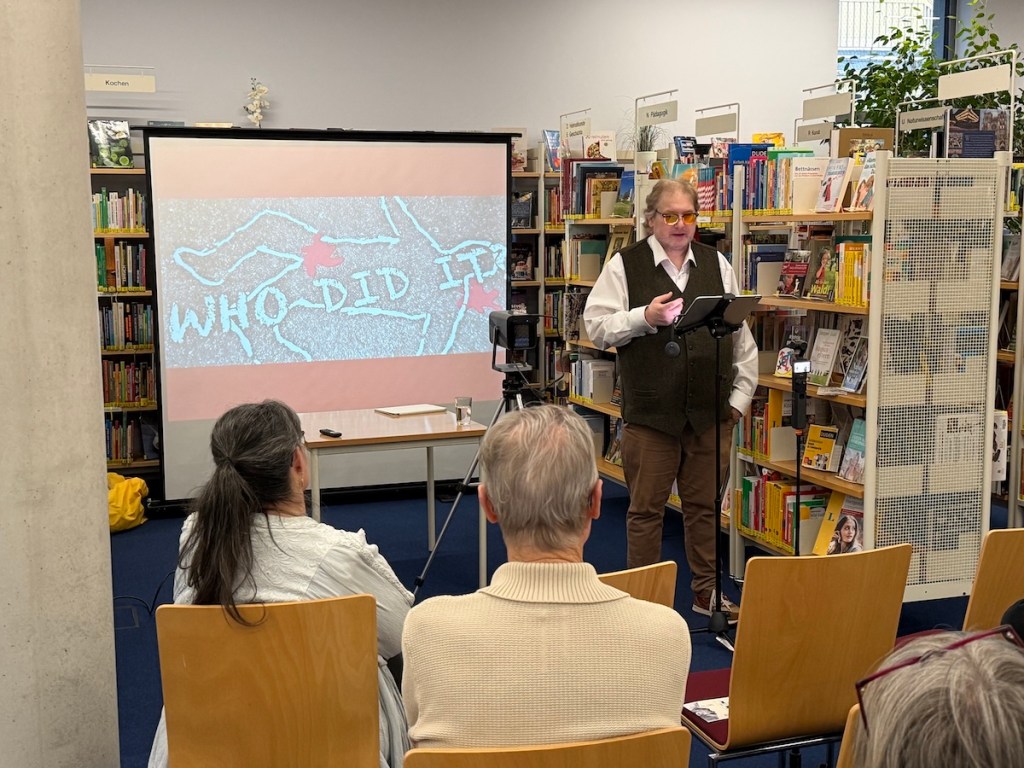 Ich führte mein Publikum mit spürbarer Leidenschaft durch die Geschichte des Krimis. Ich erinnerte an Edgar Allan Poe als Wegbereiter des Genres, an Arthur Conan Doyle mit Sherlock Holmes, an Agatha Christie mit Miss Marple und Hercule Poirot sowie an die Blütezeit des klassischen Rätselkrimis. Zugleich zeigte ich, wie sich das Genre im Lauf der Jahrzehnte immer weiter ausdifferenziert hat: vom Landhauskrimi über den Psychothriller bis hin zum Justizroman, Lokalkrimi oder Serial-Killer-Stoff. Auch aktuelle Autorinnen und Autoren wie Simon Beckett, Sebastian Fitzek oder David Safier mit seiner Reihe um „Miss Merkel“ fanden ihren Platz in meinen Streifzug durch die Welt des Verbrechens.
