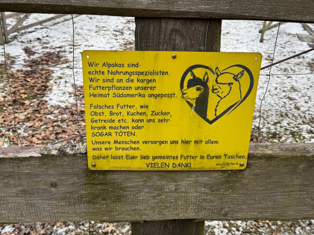 Alpakas sind Wiederkäuer und ernähren sich hauptsächlich von Weidegras und Heu. Sie benötigen Zugang zu frischem Wasser und Mineralfutter zur Ergänzung ihrer Nährstoffversorgung. Eine Überfütterung mit energiereichem Futter wie Getreide kann zu gesundheitlichen Problemen führen. Ich durfte nach dem zweistündigen Spaziergang Anton und Ludwig mit einer Art Leckerli füttern und wurde fast aufgefressen.