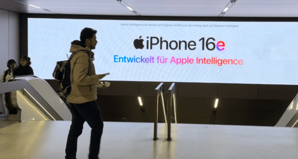 Vor kurzem ging ich am Münchner Stachus zur S-Bahn. Über den Rolltreppen flimmerte an großen Monitoren die Werbung für das neue iPhone 16e. Persönlich warte ich auf September, wenn die neue 17-Genration kommt, aber ein Detail verblüffte mich an der Werbung.