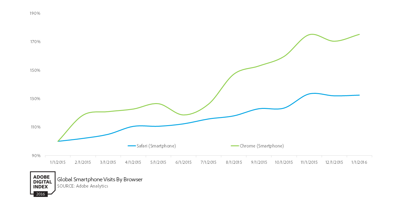 Smartphone Page Visits von Chrome übersteigen die von Safari um 127 Prozent. Heruntergebrochen auf die Browser-Nutzung bei iOS Devices zeigt sich, dass die Nutzung von Safari innerhalb eines Jahres um 34 Prozent und die von Chrome um 19 Prozent zugenommen hat. Eine Adobe-Studie fand zudem heraus, dass iPhone User den Safari-Browser (43 Prozent) vor Chrome bevorzugen (33 Prozent).